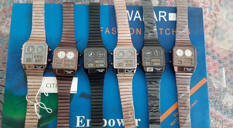 ساعت چهار زمانه حرارتی سیتیزن موتور ژاپن با اینکه اوریجنال و موتور ژاپن است و بسیار با کیفیت است ولی من طرح اصل زدم تا بعدا داستان نشه دارای ساعت دیجیتال و عقربهای دیجیتال شامل امکانات کرنومتر زنگ بیداری دماسنج نمایش ایام هفته زنگ چراغ دید در شب قوی ضد آب و ساعت عقربه ای فول دیجیتال هیدرولیک تنظیماتش را هم به زودی میزارم رنگ بندی مشکی قهوه ای رزگلد مشتری محترم بعد از خرید پیام دهد عکس رنگ بندی را بفرستم هر رنگی را خواست انتخاب کند اونو بفرستم.ممنون سیتیزن حک شده روی صفحه و درب پشتی و روی قفل ساعت موتور ژاپن کیفیت خیلی عالی