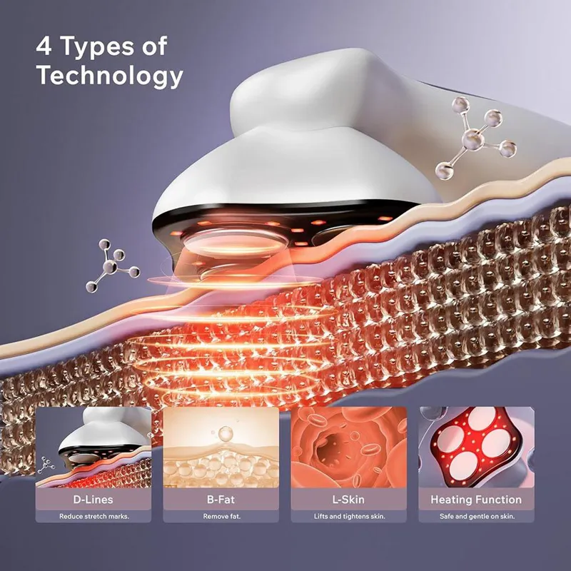 دستگاه پیکرتراشی بدن 4 در 1 این دستگاه پیکرتراشی ارتقا یافته مجهز به 3 حالت و 1 عملکرد گرمایشی است، (D: کاهش علائم کشش، B: حذف سلولیت، لیفت از بدن L.)، گرمایش ترموستاتیک 37-42 درجه سانتیگراد (98.6) درجه) F-107.6 درجه فارنهایت، از طریق استفاده برای ارتقای
