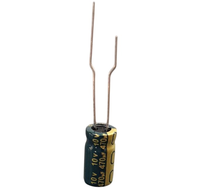 این خازن از نوع الکترولیتی است که به دلیل طراحی خود با استفاده از محلول الکترولیت، میتواند مقدار زیادی بار الکتریکی را در مقایسه با سایر انواع خازنها ذخیره کند.ظرفیت آن 470 میکروفاراد (470µF) و حداکثر ولتاژ قابل تحمل آن 10 ولت است.
