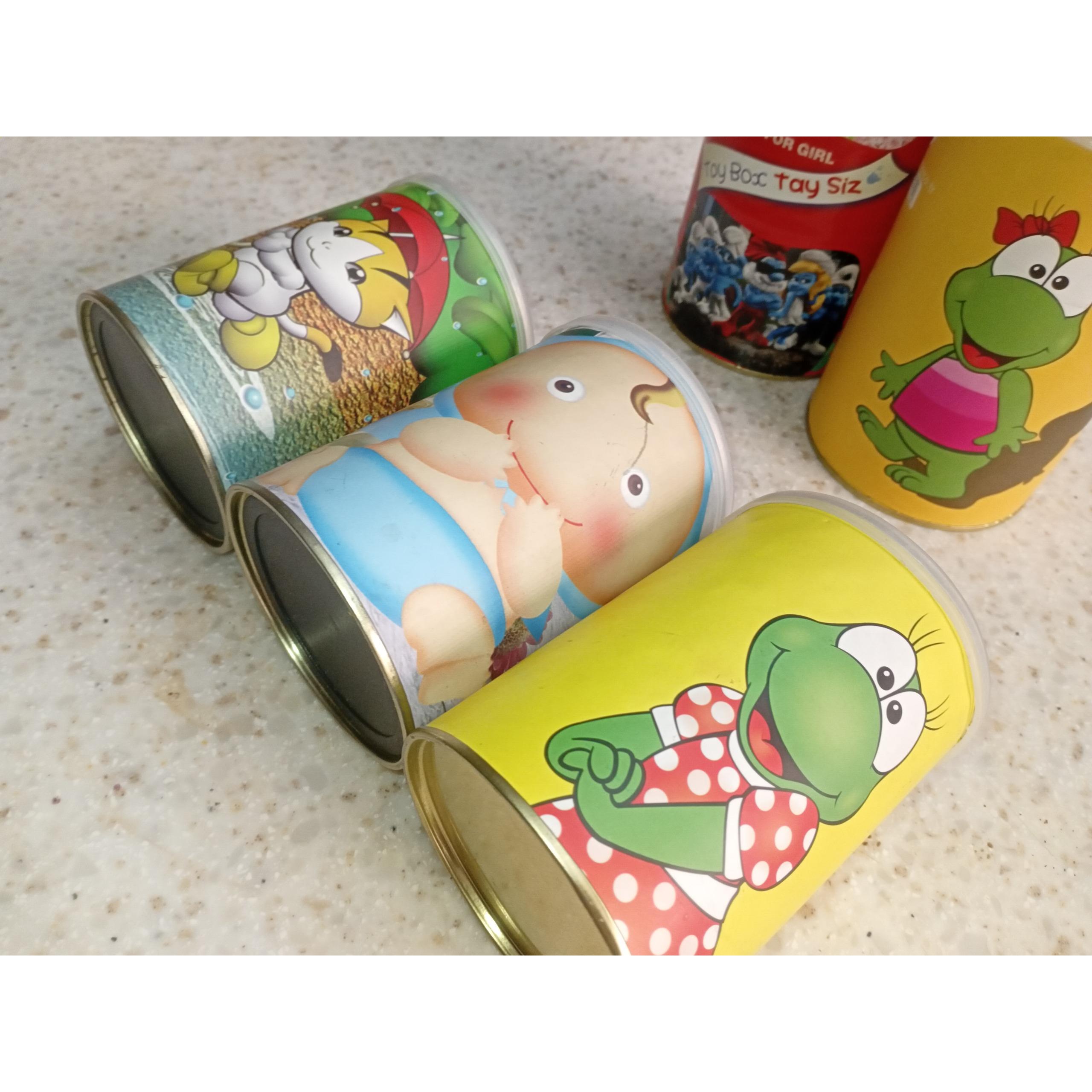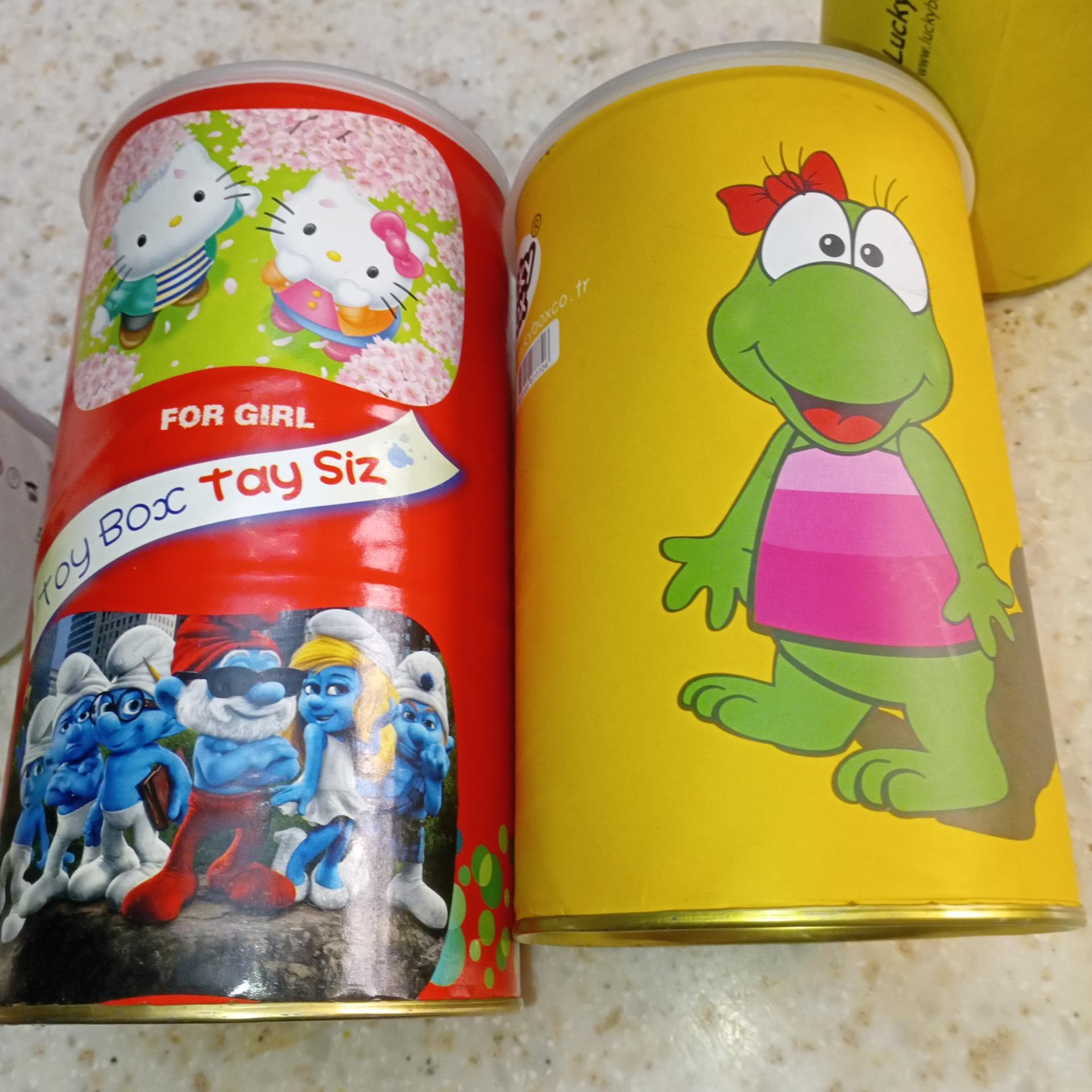 قوطی های فانتزی جنس مقوای ضخیم و ته کار فلزی روی کار کاغذ گلاسه رنگی چهار عدد مارک Lucky Box خارجی، و یک عدد ToyBoxایرانی
