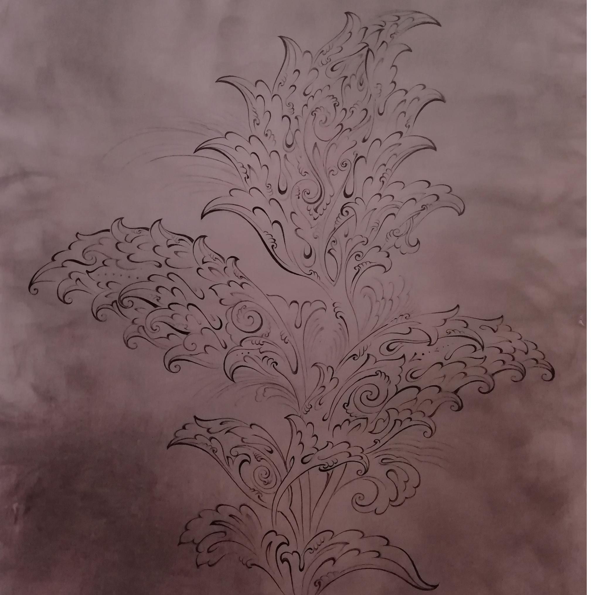 تکنیک رنگی آبرنگ و مرکب بر روی مقوا ماکت آغشته به دود ( در اثر رقص دود خطوط ریتمیک بسیار زیبایی روی مقوا ایجاد شده)