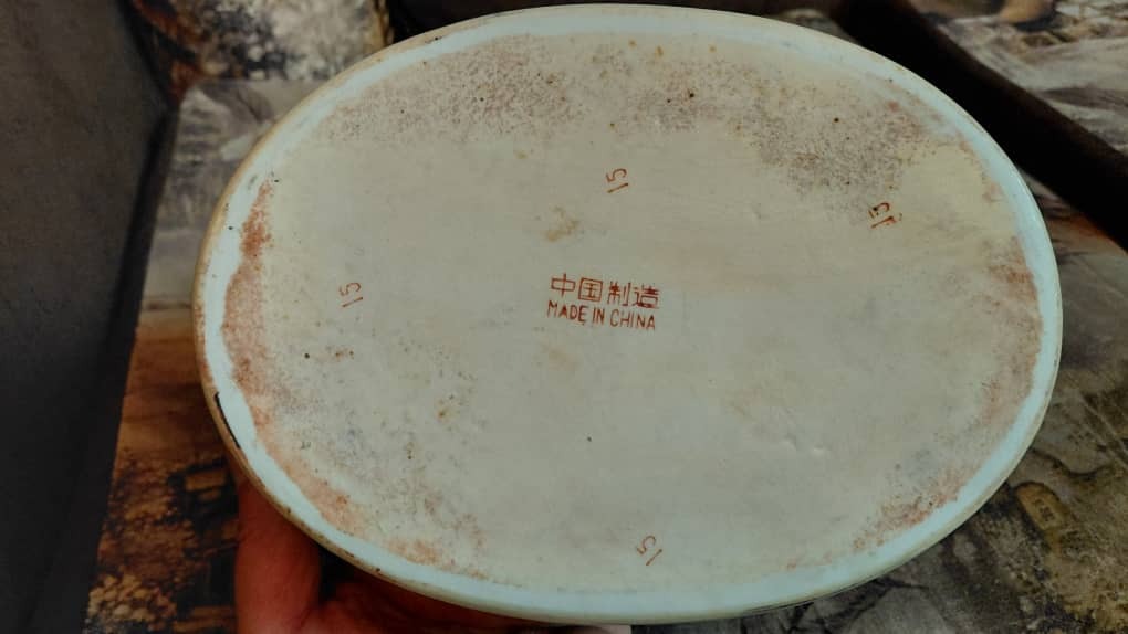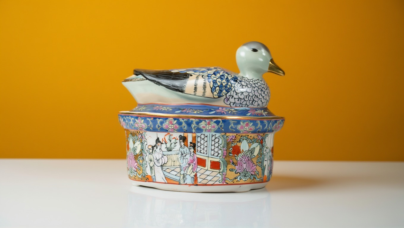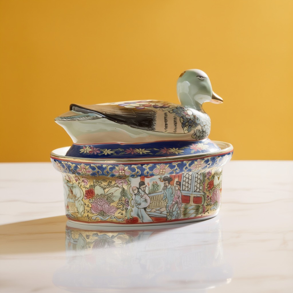 شکلات خوری گل مرغی چینی قدیمی تمام نقاشی دست برجسته شکا مرغابی یک کار استثنایی و بی نظیر داخل ویترین نگهداری شده.