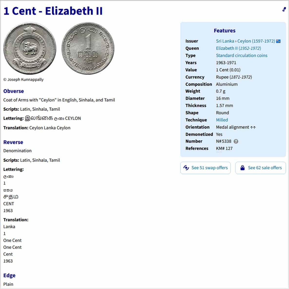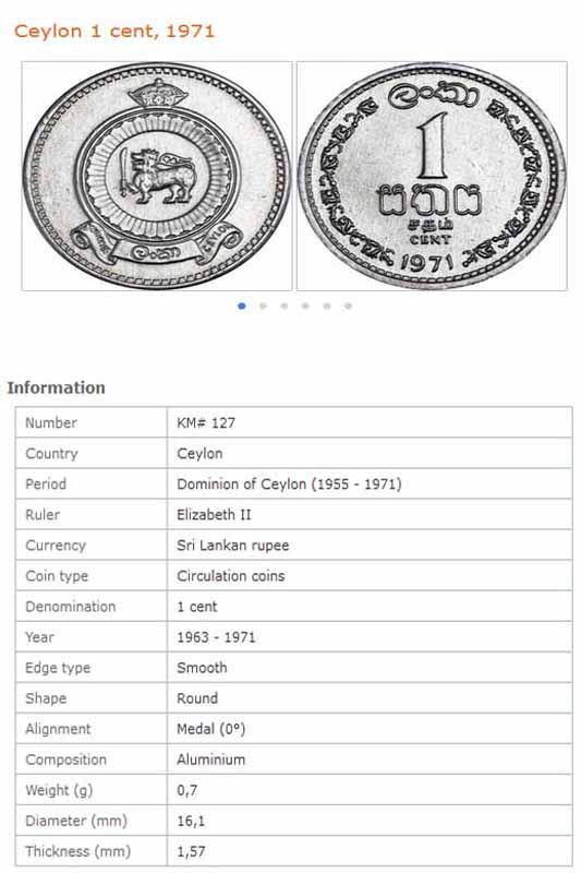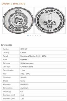 سکه 1 سنت سریلانکا 1971 (نایاب) دوره الیزابت دوم
