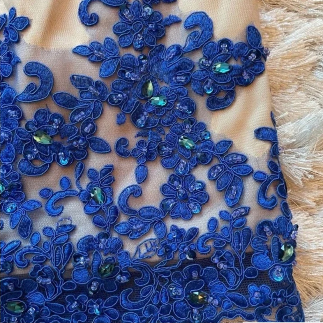 لباس مجلسی ماکسی برند سیندرلا،سایز38 به سایز 36هم میخوره اما کمی گشاد ایستایی دارد که لازم است تنگ شود،متریال گیپور و پلی استر100درصد،سایز مدیوم که هم به لارج میخورد هم اسمال،لارج درصورتی که شکم و پهلو نداشته باشید،بر روی لباس سنگهایی آبی کاربنی کار شده لباس رنگ بدن میباشد گیپورهای کار شده روی آن رنگ آبی کاربنی هستند،لباس از قسمت زانو زیپ دارد و دنباله به آن متصل میشود هم قابلیت استفاده با دنباله و هم بدون دنباله را دارد