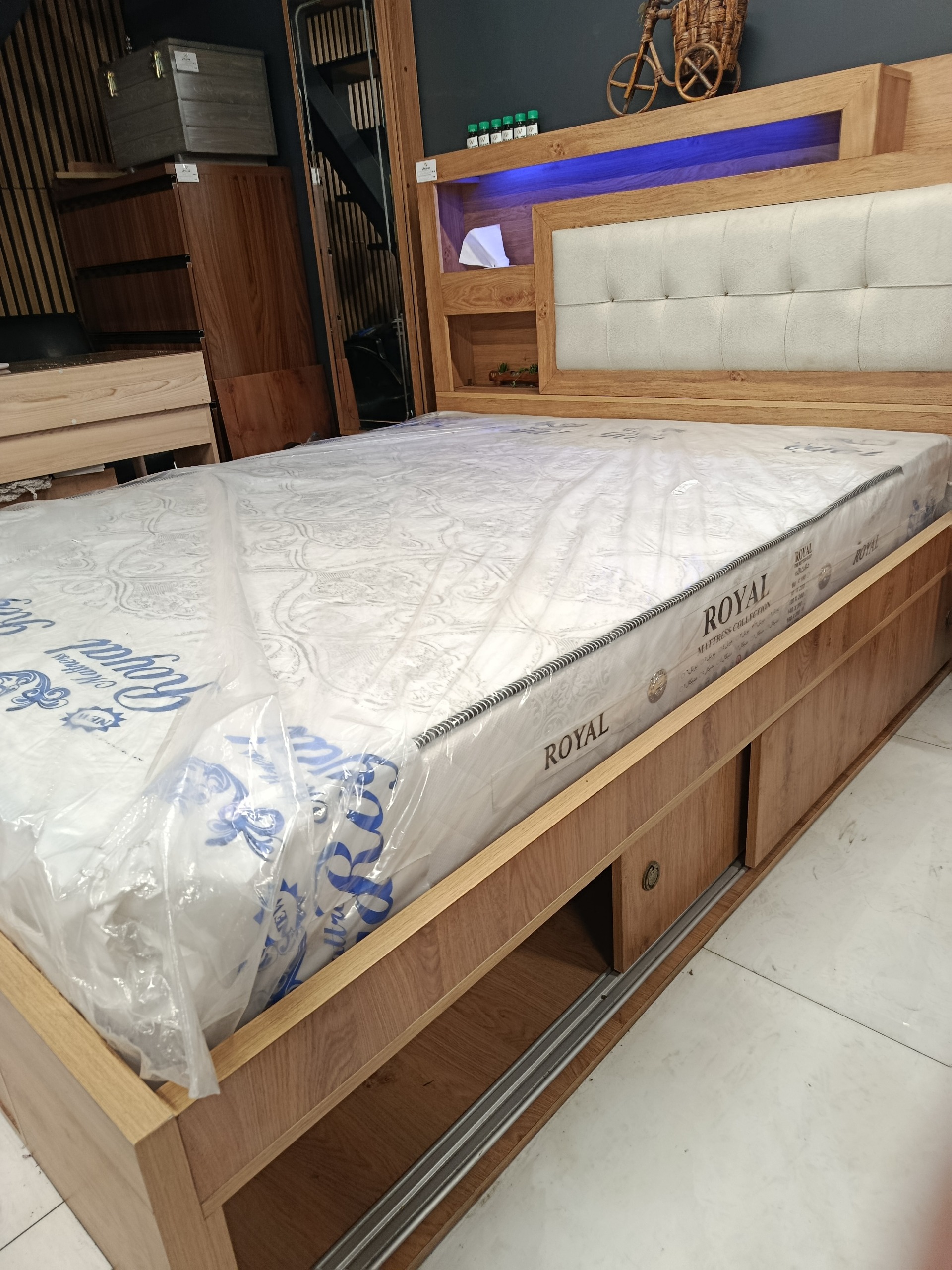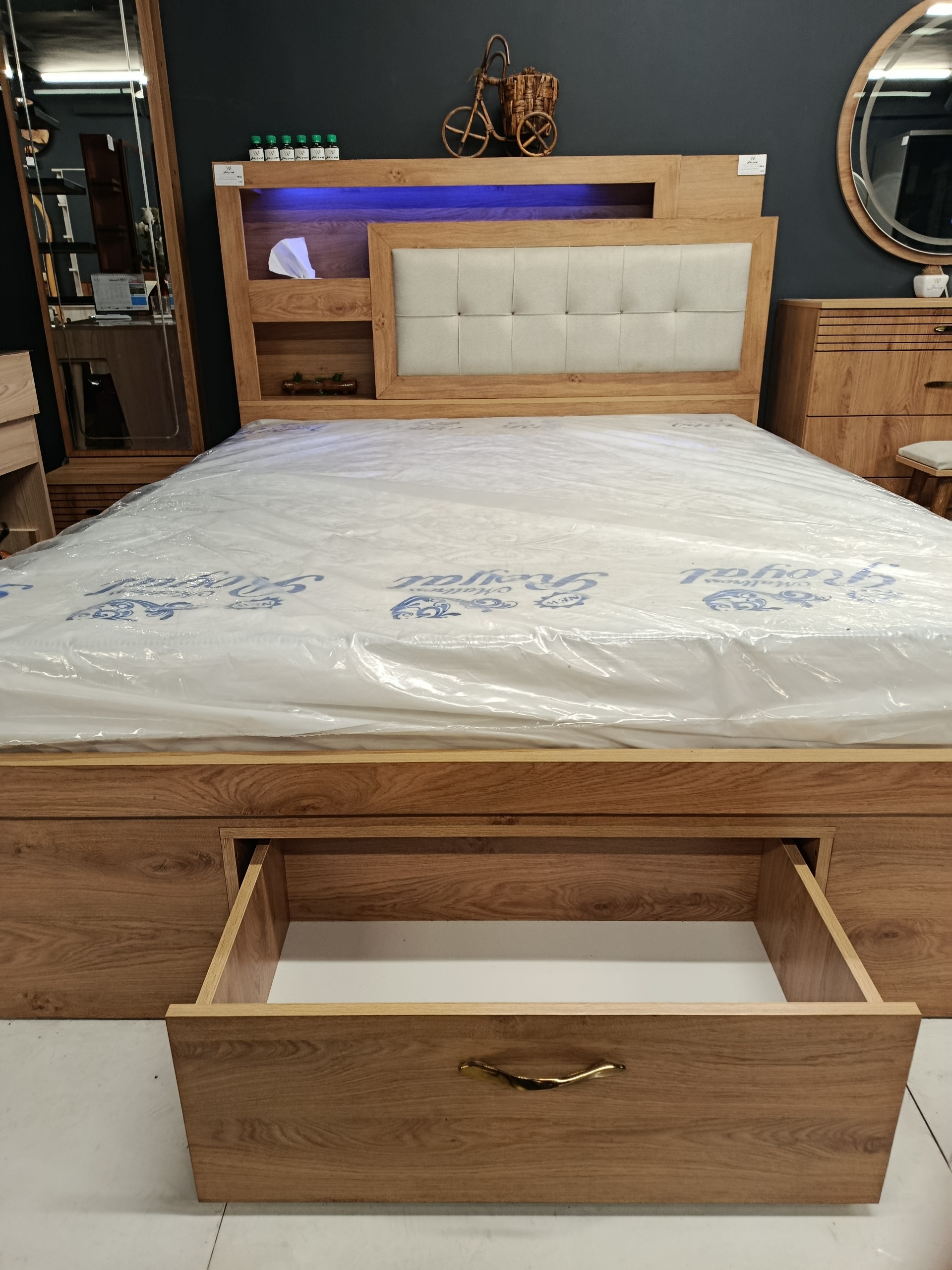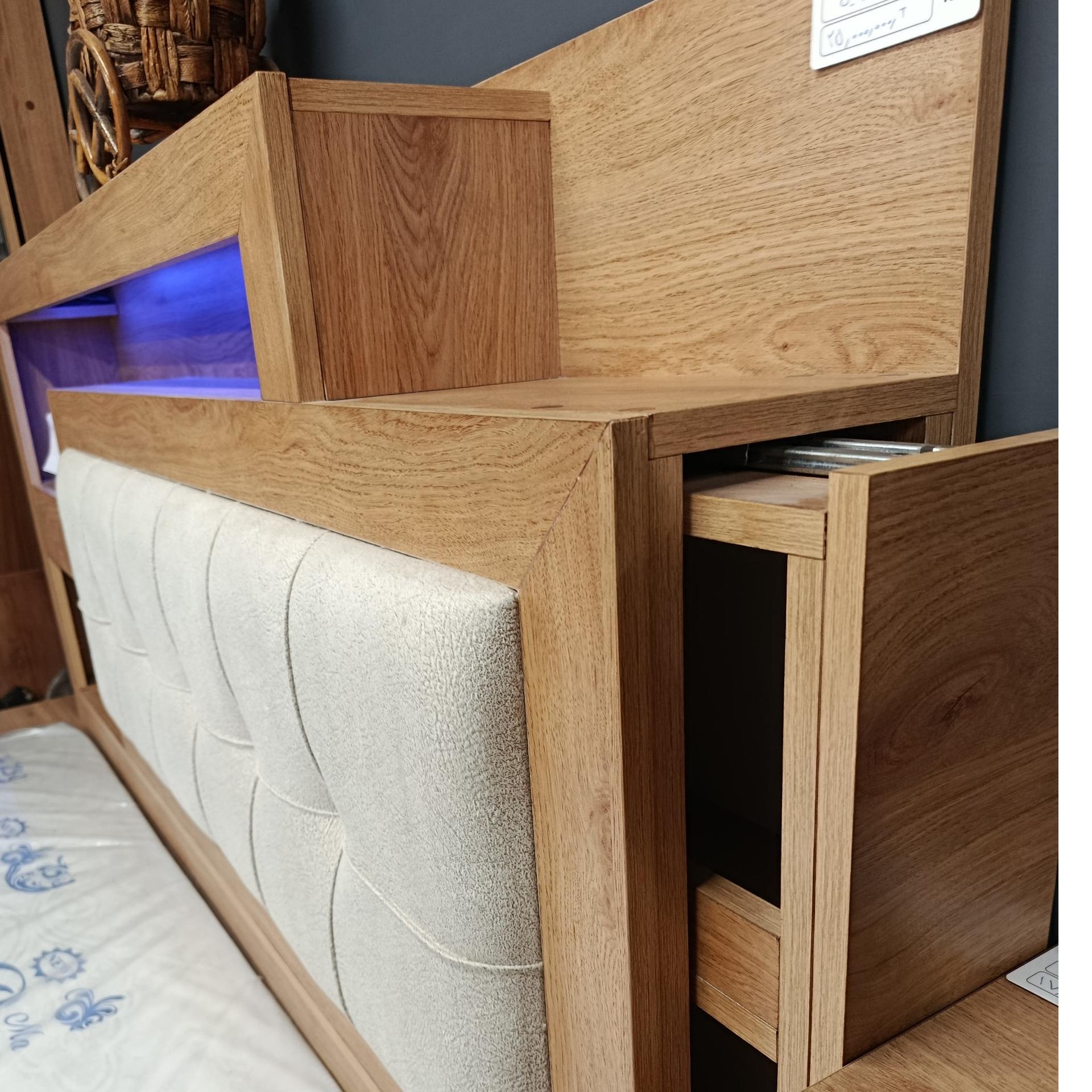 تخت دو نفره نیایش200+160 سه طرف تخت باکس و کشو دارای چراغ خواب کشو های مخفی روی تاج تخت قابلیت تغیر رنگ و اندازه به سلیقه خود مشتری دارای 2سال ظمانت