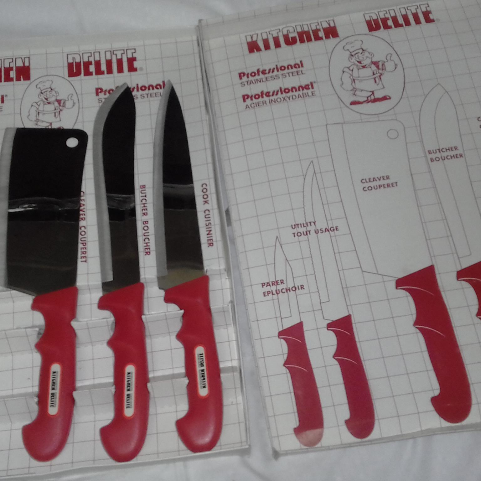درعکس پنج عدد چاقو هست ولی چهارعدد چاقو موجوده ویک عدد قیچی آشپزخانه چاقوها نیاز به تیز کردن دارد