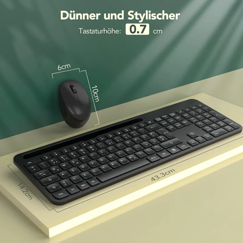• بسیار نازک و بی صدا نازک ترین قسمت صفحه کلید تنها 0.7 سانتی متر ضخامت دارد، در حالی که ضخامت صفحه کلید سنتی به 1.5 سانتی متر می رسد. صفحه کلید بی سیم بسیار نازک و سبک است و حمل آن بسیار راحت است. دکمههای صفحهکلید و ماوس بیسیم برای کاهش صدای کلیک تا بیش از 98 درصد طراحی شدهاند، بنابراین میتوانید در هر محیط ساکتی بدون نگرانی از مزاحمت دیگران، از جمله کتابخانه یا اواخر شب، از آنها استفاده کنید.