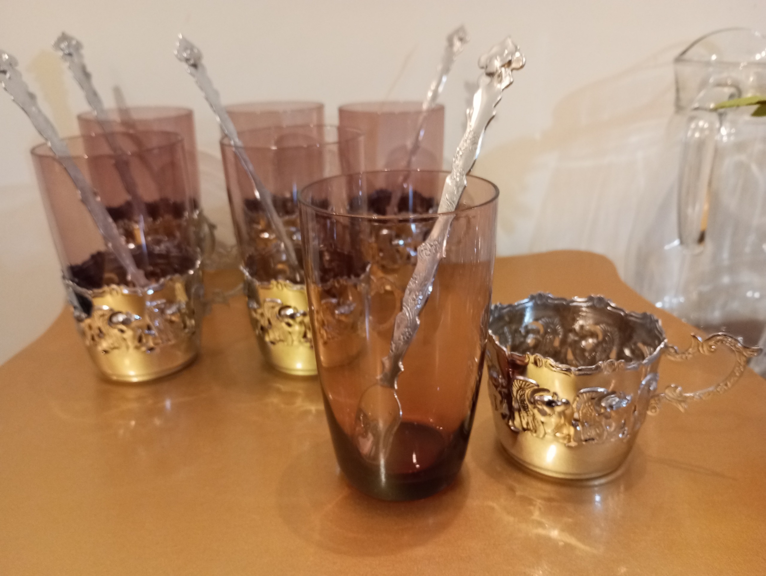 یک دست سرویس 6 عددی لیوان مجلل کلاسیک قدیمی و بسیار آنتیک ، مناسب هدیه و جهیزیه و پذیرایی و مهمانی . لیوان ها بلور شفاف و درخشان بنفش ، هر لیوان 3 بخش دارد : قسمت اصلی لیوان که بلور بنفش رنگ هست ، پایه و یا انگاره استیل طرح پیوتر و یک عدد قاشق استیل.