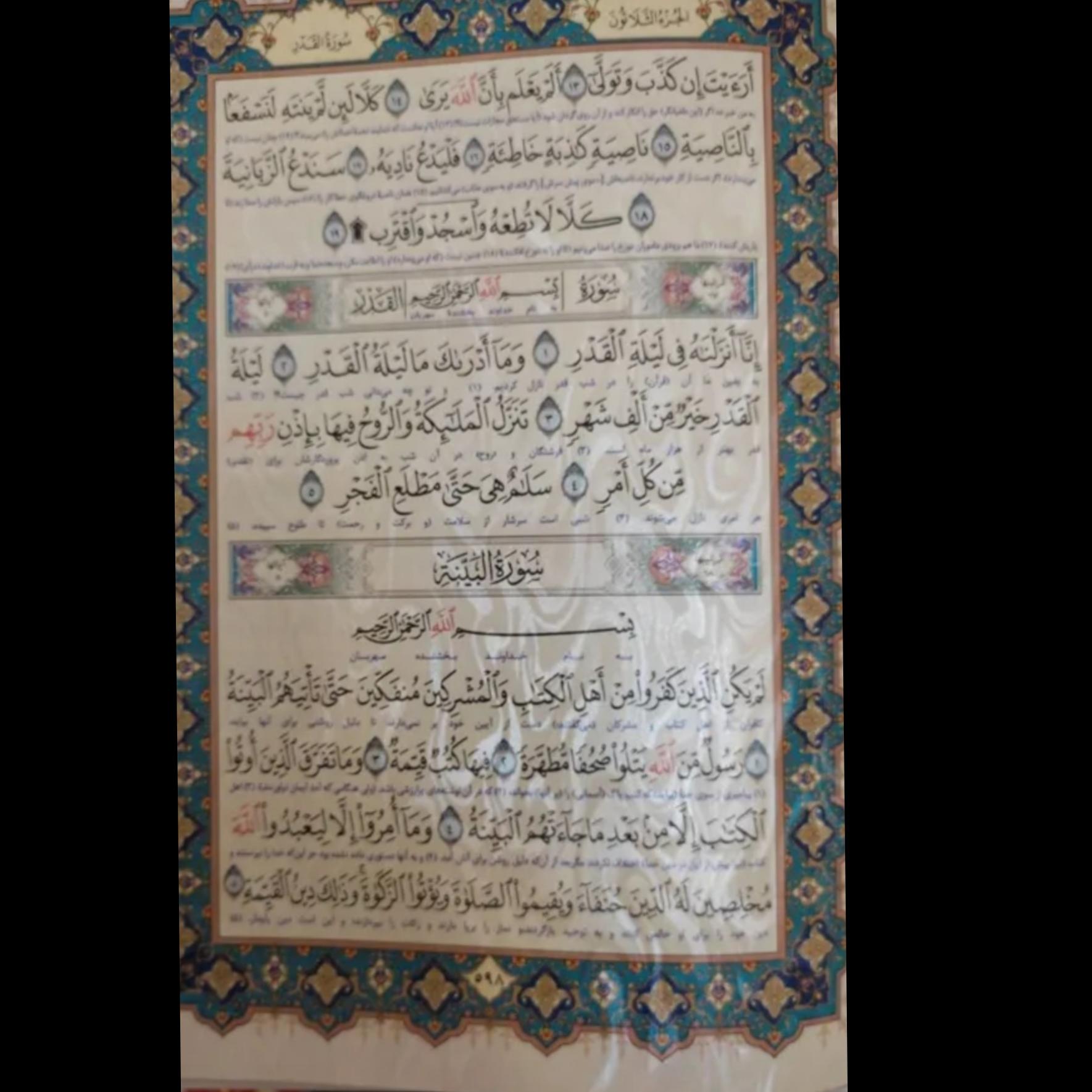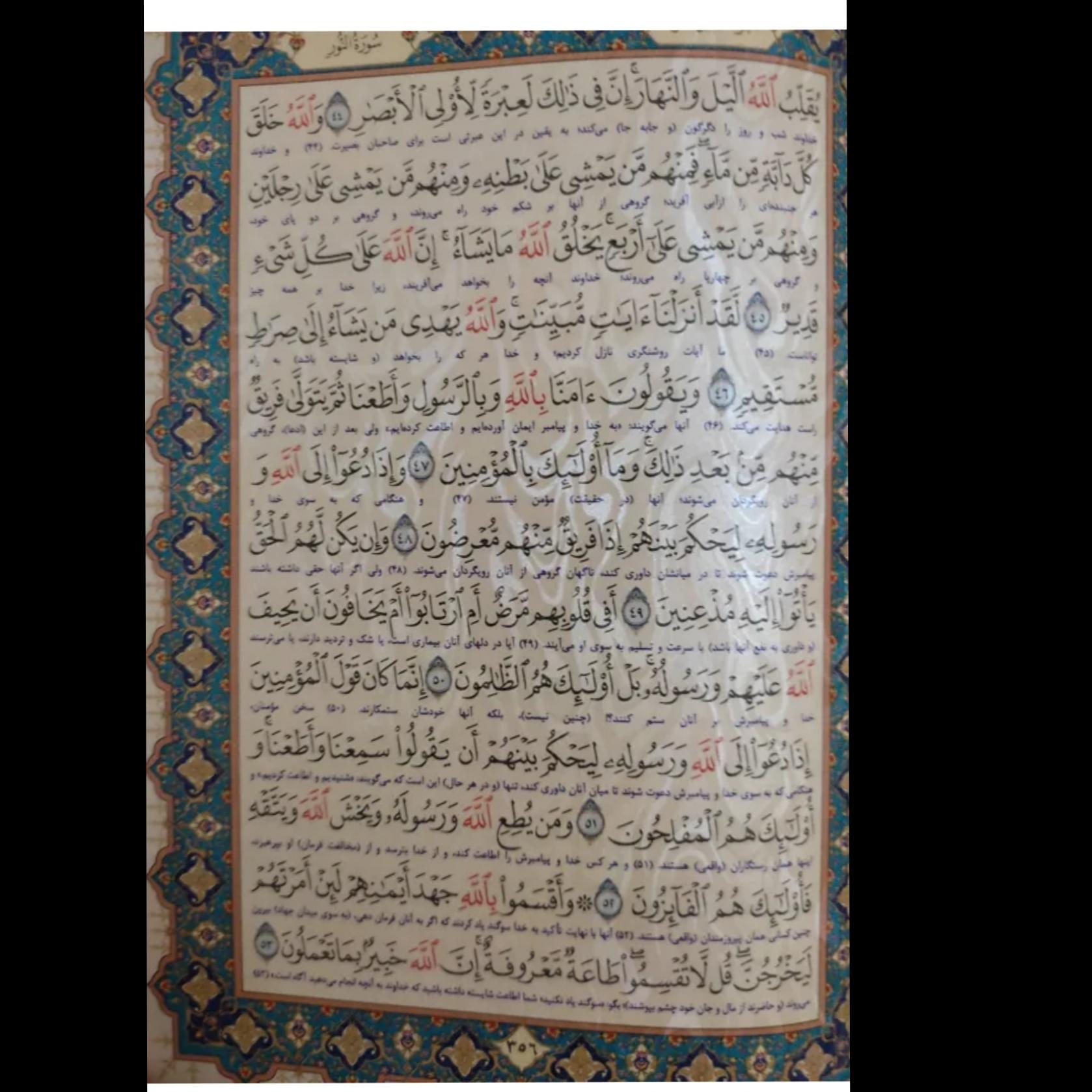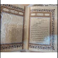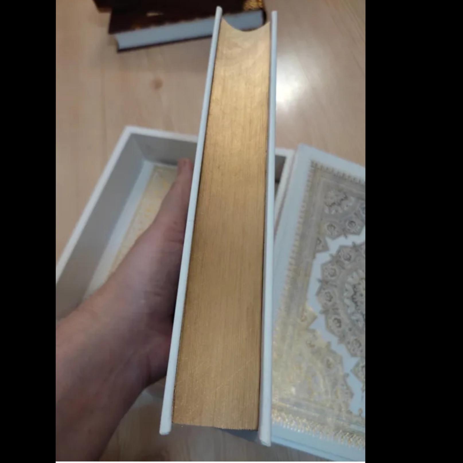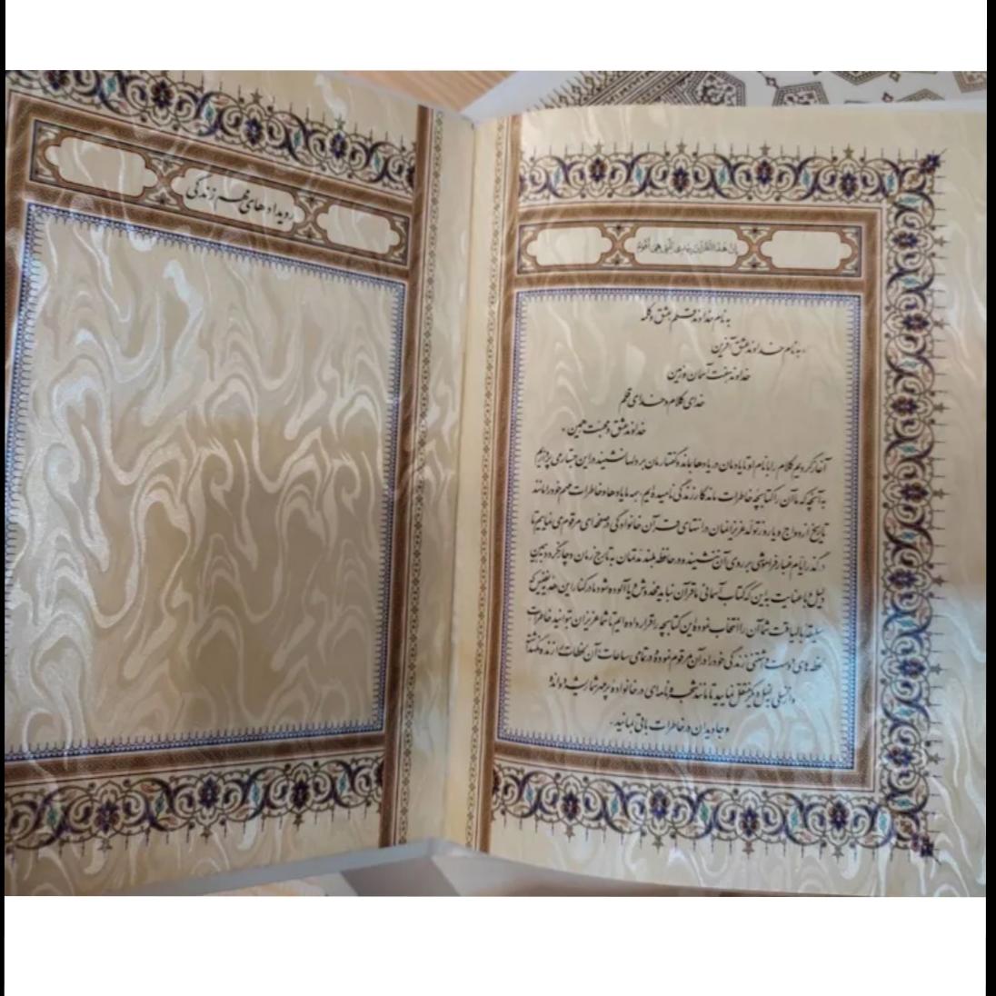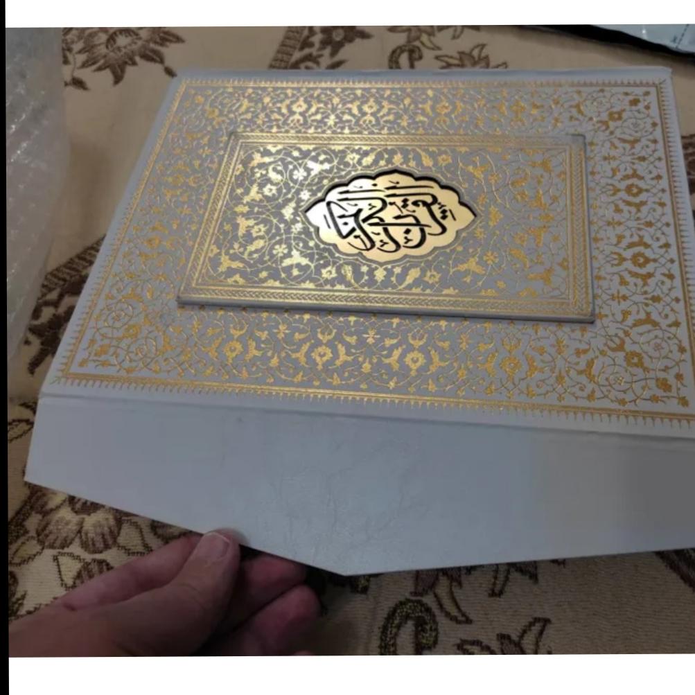 یک جلدقرآن نفیس معطر وزیری سفید باصفحات مخصوص وکمیاب لبه طلائی مارگانو وخیلی گران وآنتیک ازنظر برگها بلحاظ زیبائی ومحکم بودن کمیاب بوده و اسماء جلاله کلابخط قرمز نگاشته شده وتذهیب بسیار زیبا و باخط عثمان طه در600صفحه نگاشته شده توسط استادناصرمکارم شیرازی