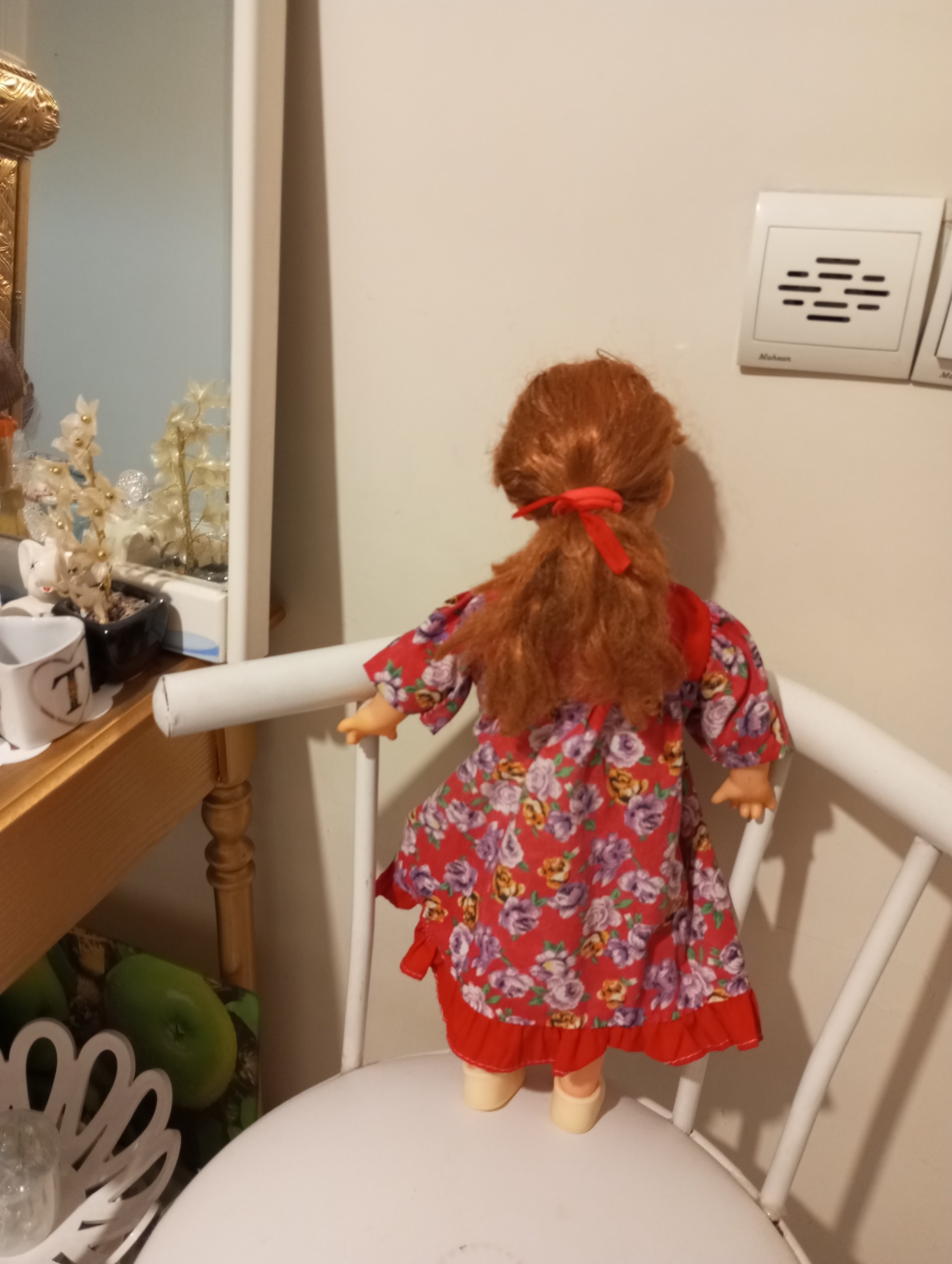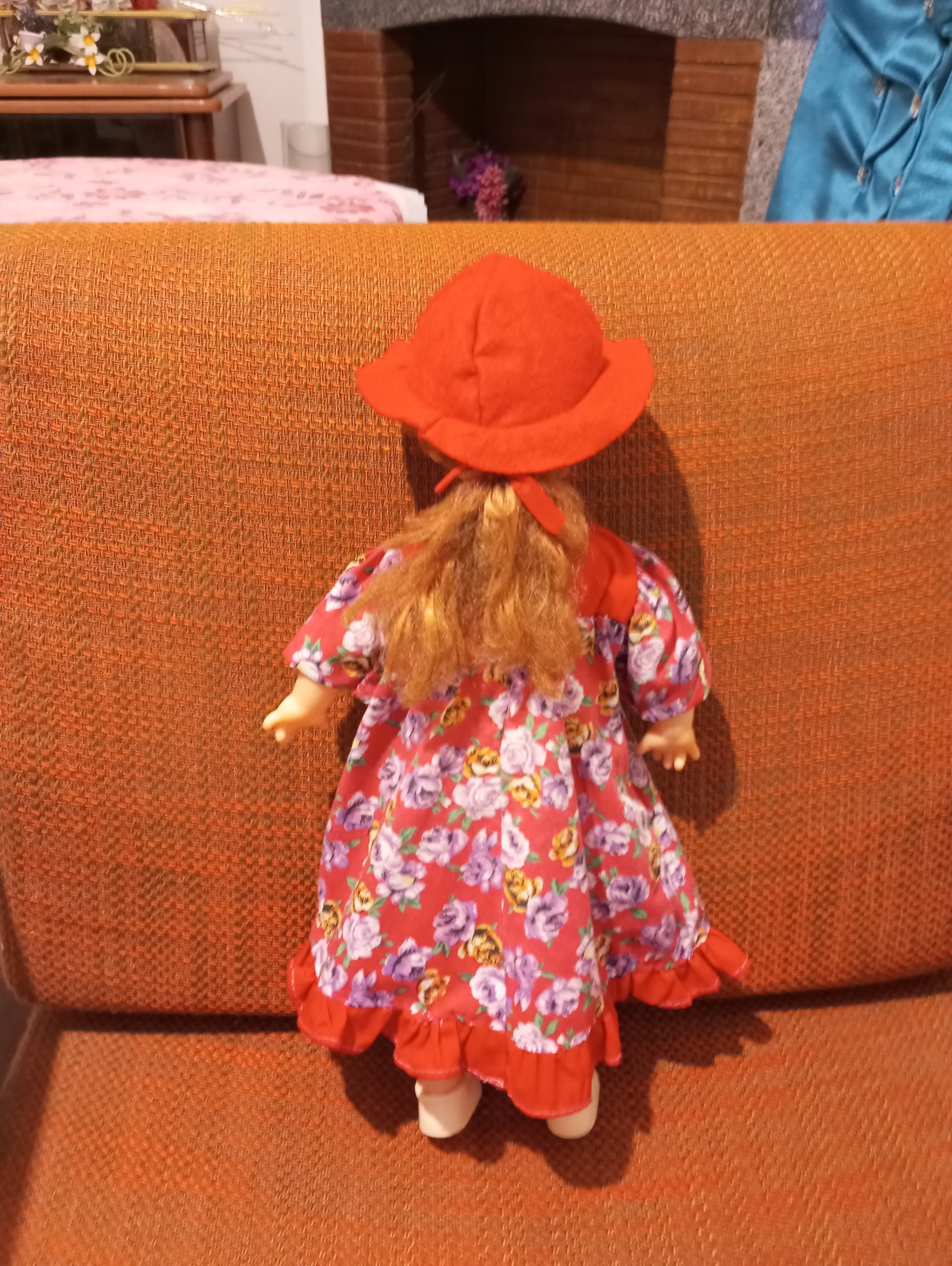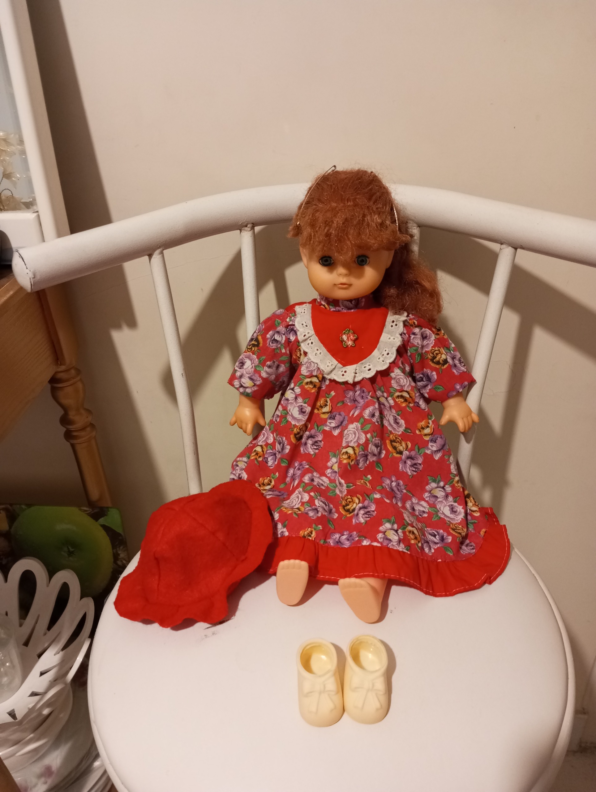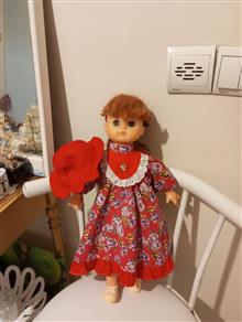 عروسک دختر زیبای مو حنایی و چشم آبی ابعاد 40 سانتیمتر پیراهن زیبای قرمز و گلدار مجلسی و کلاه قرمز و کفش سفید دارد. دو عدد سنجاق سر فرانسوی و روبان قرمز هم به موهاش خورده. جنس سر و دست و صورت عروسک پلاستیک مرغوب pvc هست و جنس بدنش پارچه هست .ارتفاع این دختر زیبا 40 سانتیمتر هست. وزنش با لباس حدود 400 گرم. چشم های عروسک هم باز و بسته می شود. عروسک خارجی و کمیاب در بازار هست با بهترین مواد و ساخت ، زیبا و با کیفیت و ماندگار .