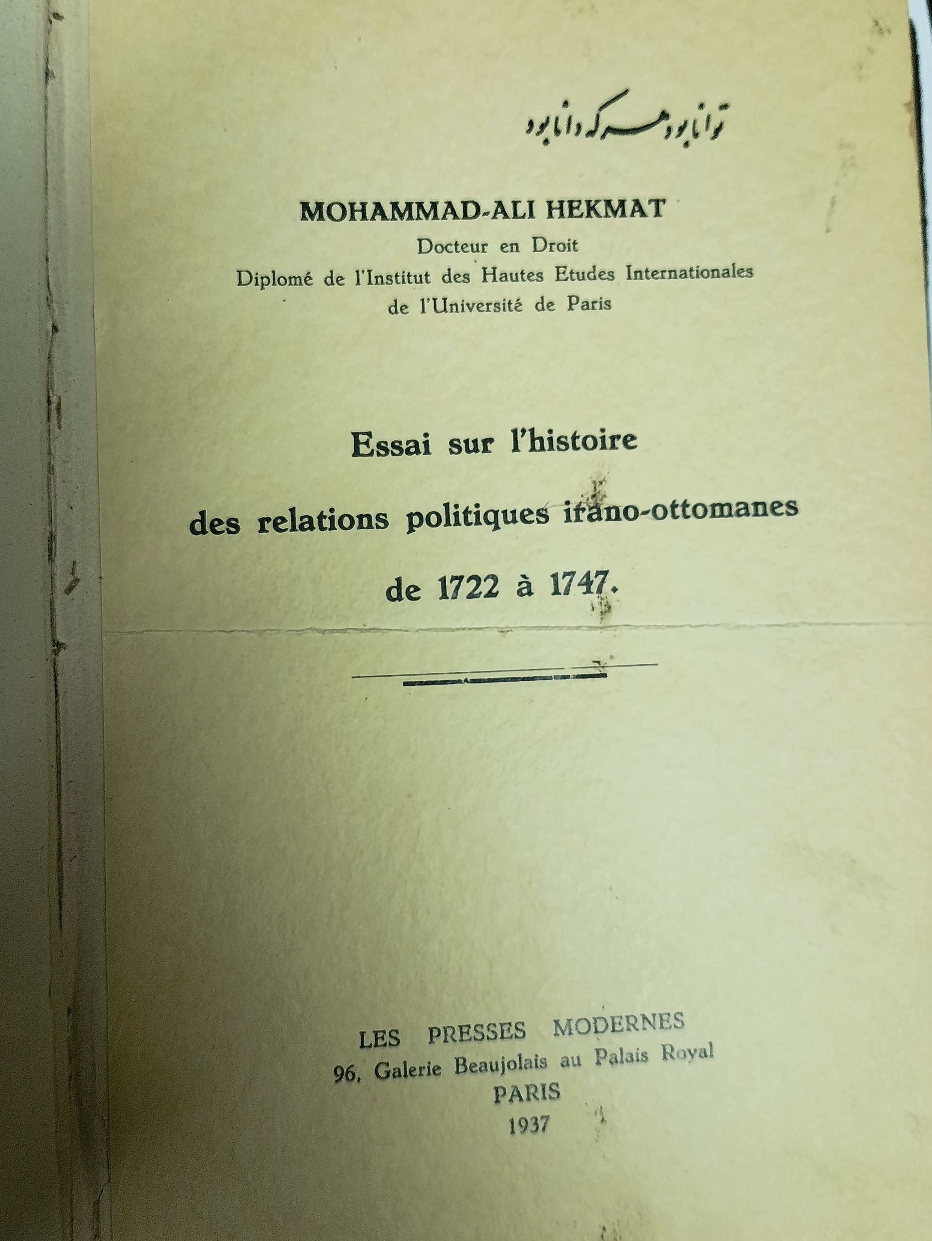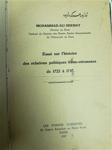 ترجمه(مقاله در تاریخ روابط ایران و عثمانی. از 1723 تا 1742. اثر محمد علی حکمت چاپ شده در پاریس سال 1974 .وزیری جلد سخت و چرمی تعداد صفحات کتاب 310 صحفه که روی کاغذ مرغوب و بصورت سربی بچاپ رسیده است. کتاب دارای دو نقشه که روی گلاسه بچاپ رسیده دارد که بسیار