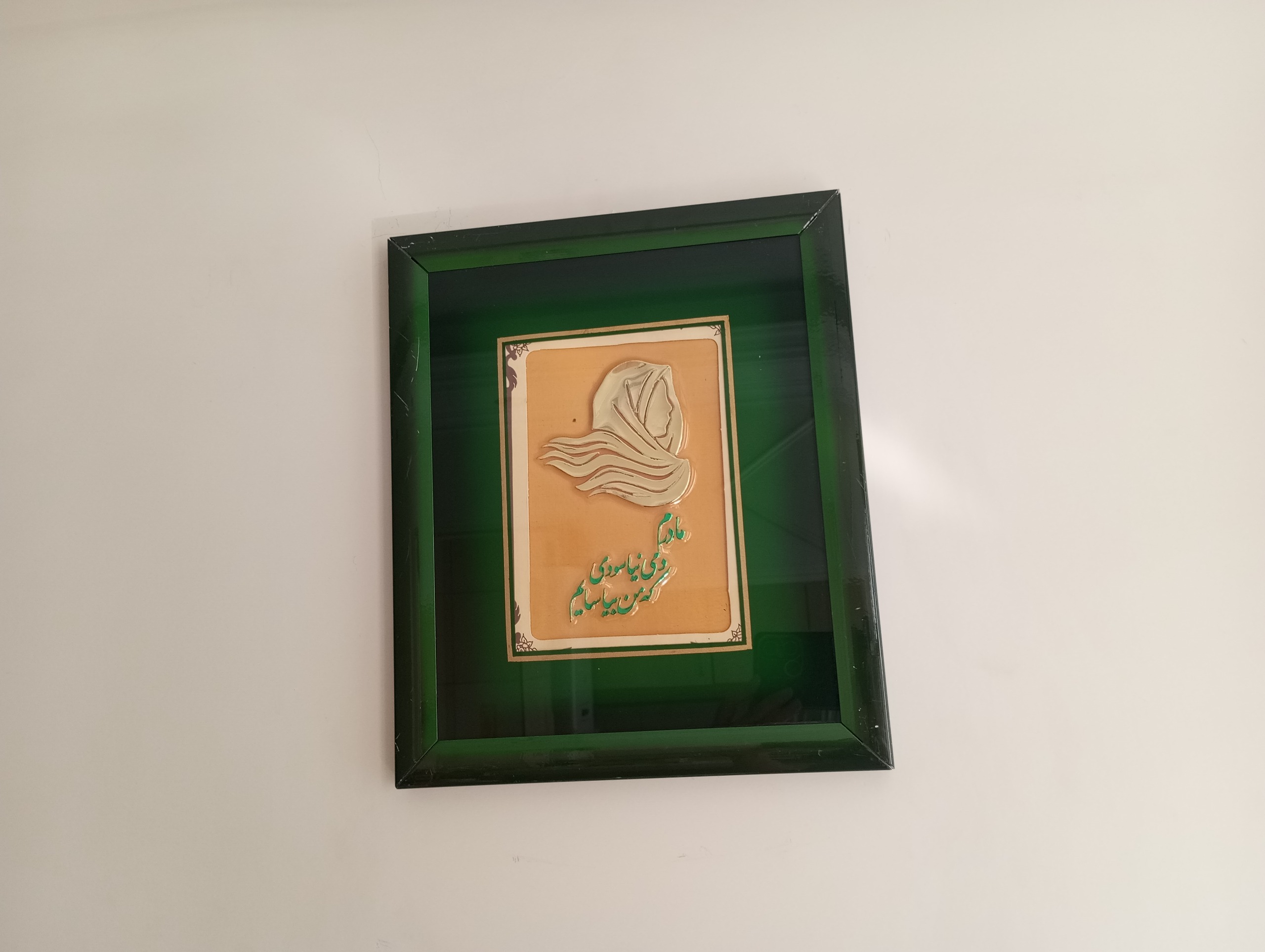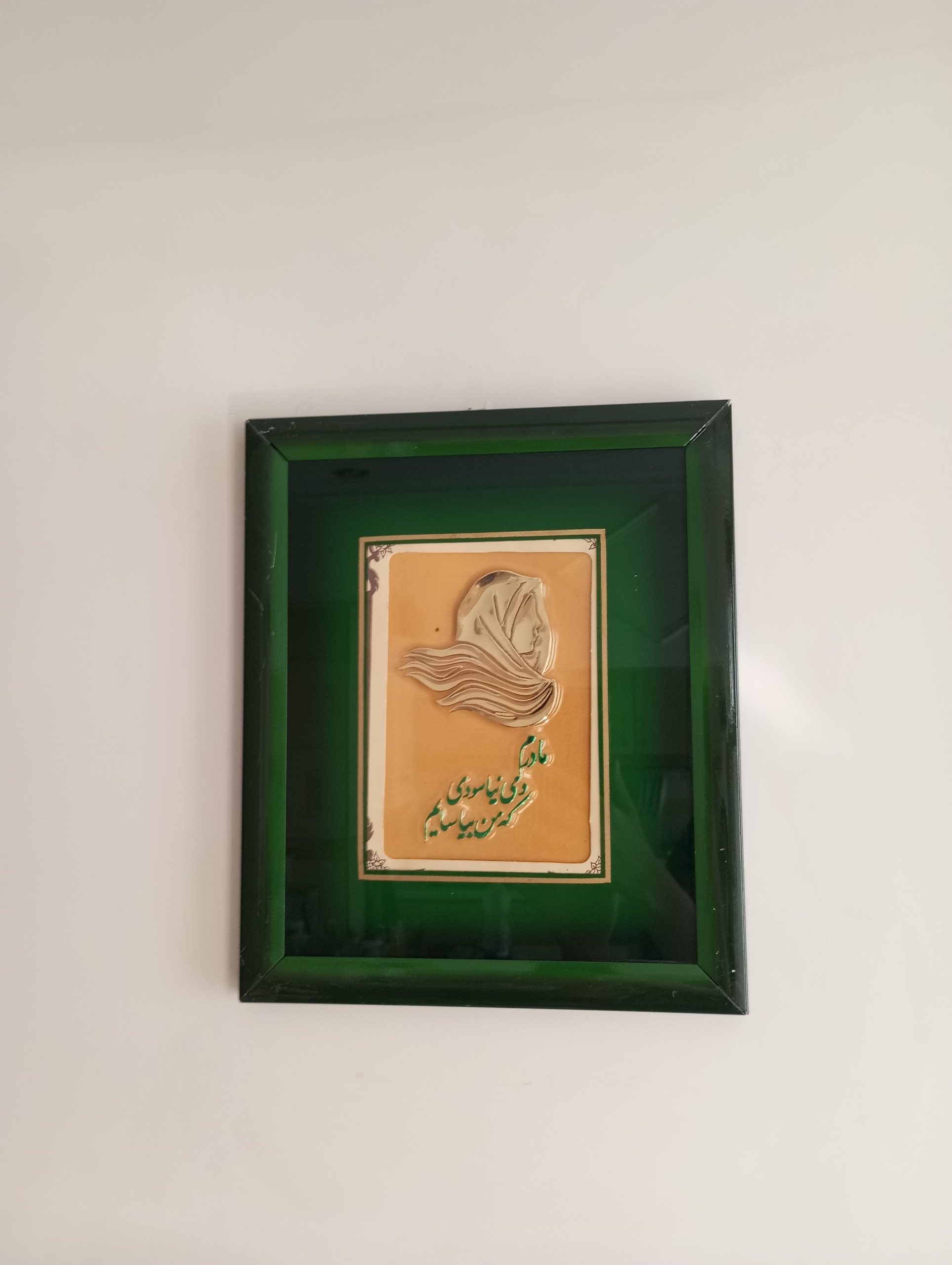 تابلوی قدیمی و نوستالژیک دکوری گرامیداشت و هدیه روز مادر ، فلزی با قاب شیشه ای ، داخلش طلایی رنگ و زمینه سبز ، با شعر خوش نویسی شده : «مادرم دمی نیاسودی تا من بیاسایم» ابعاد تابلو 31 در 26 سانت، سالم و تمیز . دو سه تا خط حاشیه چپ تابلو داشته از روز اول که انعکاس نور میافته و اصلا مشخص نیست. یک هدیه زیبا ، مناسب تزیین منزل ، به راحتی به دیوار نصب می شود . قیمت با احترام مقطوع. ارسال از طریق تیپاکس و بسته بندی محکم و استاندارد. ارسال رایگان هست.