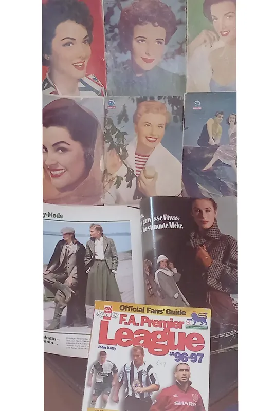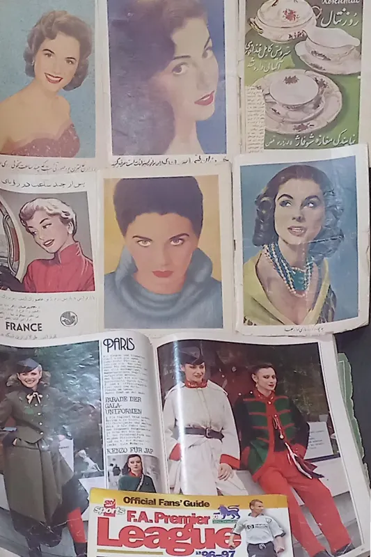 6عدد مجله خواندنیها 40 صفحه ای هست که جلد روغنی و مابقی کاهی هستن و مجله مد و پوشاک هم 185صفحه همش روغنی و جلد اصلی و چندتا از صفحات کنده شده و مجله لیگ انگلستان هم128 صفحه بسیار جذاب ورنگی و روغنی میباشد که سال 76یا76یه دوستی از لندن برام هدیه آورد.
