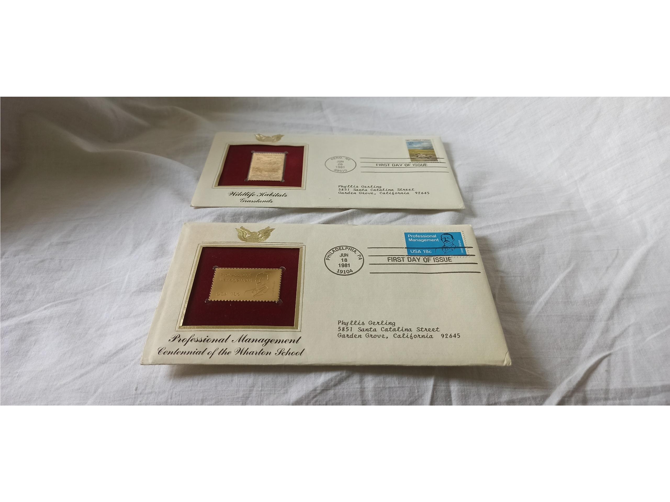 یکیش به مناسبت صد سالگی مدرسه وارتون چاپ 1981 شده حاوی تمبر باطل شده ویژه آن روی پاکت و کارت تمبر روکش طلای آن داخل پاکت