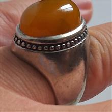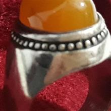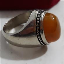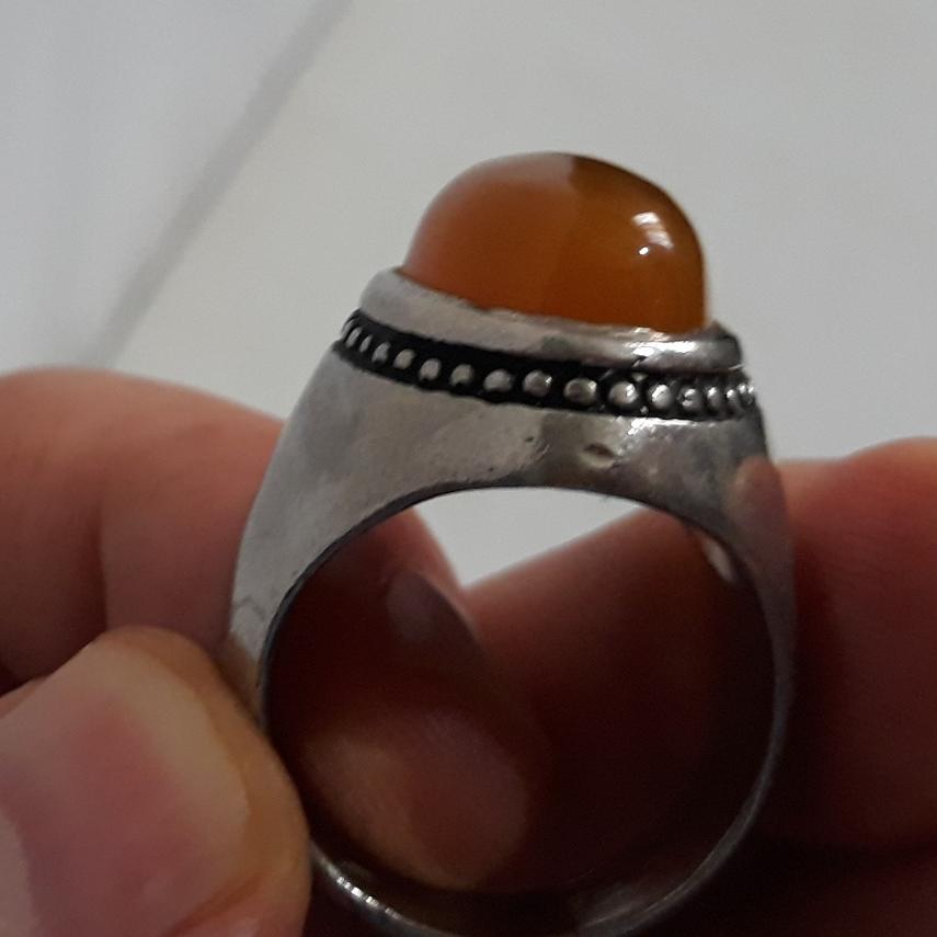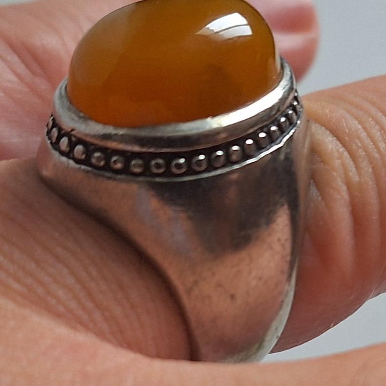 یک عدد انگشتر رکاب سنگین با وزن کلی کمی بیش از 20 گرم با نگین عقیق شکلاتی خردلی خوشرنگ درست برابر با تصویر . احتمال دارد نقره کم عیار هم باشد که اگر شد نوش جان مشتری ولی بنده به عنوان رکاب غیر نقره آگاهی نمودم .