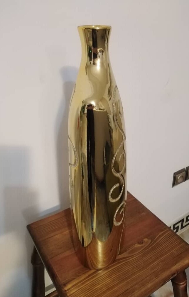 این گلدان دست ساز و خارجی میباشد بسیار زیباست و مثل طلا میدرخشد طراحی مدرن و خاصی داره جنسش سفال لعاب کاری شده است و بعد هم ابکاری شده.