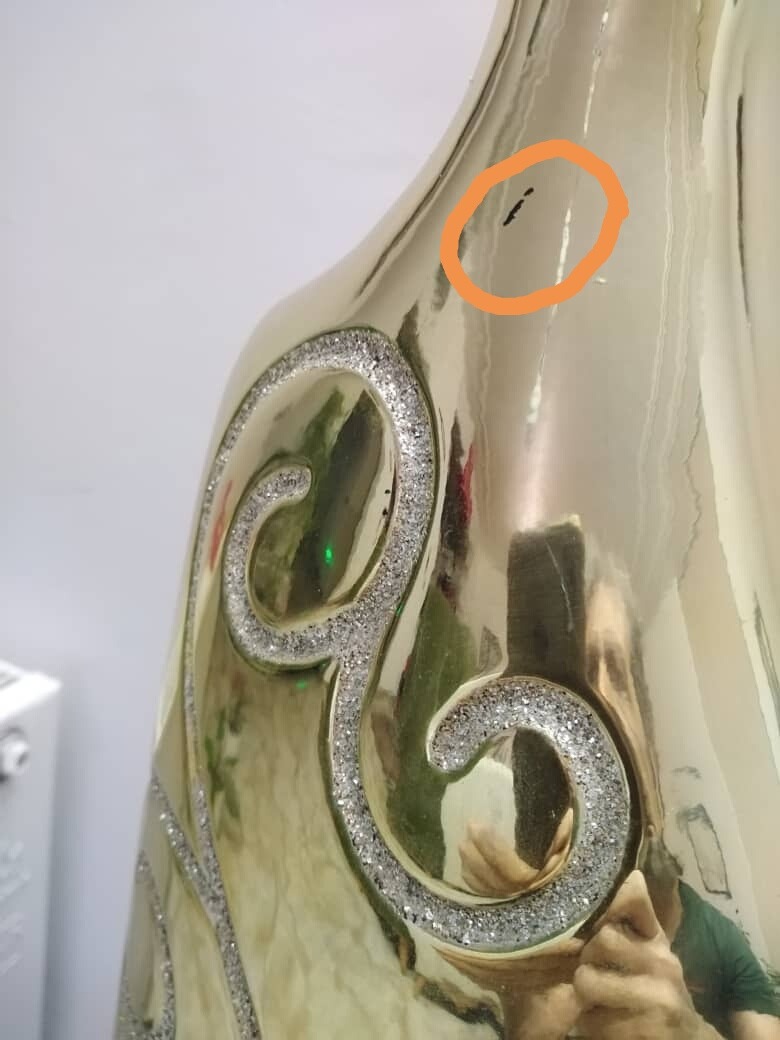 اگه بخوام شرایطشو بگم هیچ مشکل ساختاری؛ شکستگی؛ لب پریدگی؛ ترک و... نداره از لحاظ ظاهری اگه الان شما بذاریدش داخل منزل هرکسی ببینه فکر میکنه همین الان از فروشگاه خریدید منتها اگه ریز بشید چند تا خش سطحی داره چند قسمت هم ابکاری روش در حد میلیمتری خراشیده شده که عکسشون رو گذاشتم و علامت زدم تمام این ها رو گفتم که کاملاً بدونید چی میخرید در واقع میتونستم بزنم در حد نو ولی زدم دست دوم که جای بحث نباشه ایرادایی که گفتم براحتی قابل برطرف شدنه ولی به نظر من نیازی نیست دستکاریش کنید فقط باید خوب نگهداری بشه؛ کمی ورق طلا همراه با جنس براتون ارسال میکنم که اگه خیلی حساس بودین درستش کنید ولی دست یه آدم وارد بدید.