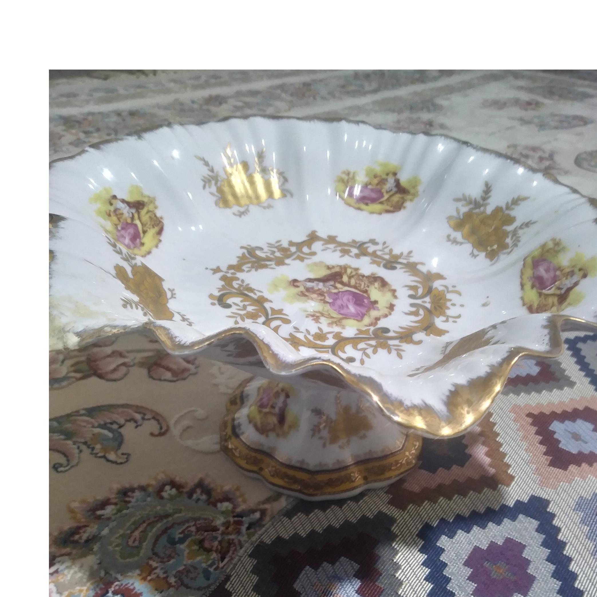 میوه خوری چینی پایه دار طرح لیلی و مجنون کار زیبا لب ودور طلایی گرد فقط لبه یک طرف 1سانت در یک سانت ترمیم شده (نمونه لیلی مجنون پایه دار دور طلا گرد موج دار جز طرح ها و مدل کم یاب حساب میشود)