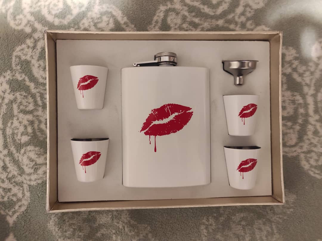 جنس استیل/قابل حکاکی/ظرفیت 240میل دارای نگهدارنده درب و قیف همراه 4شات
