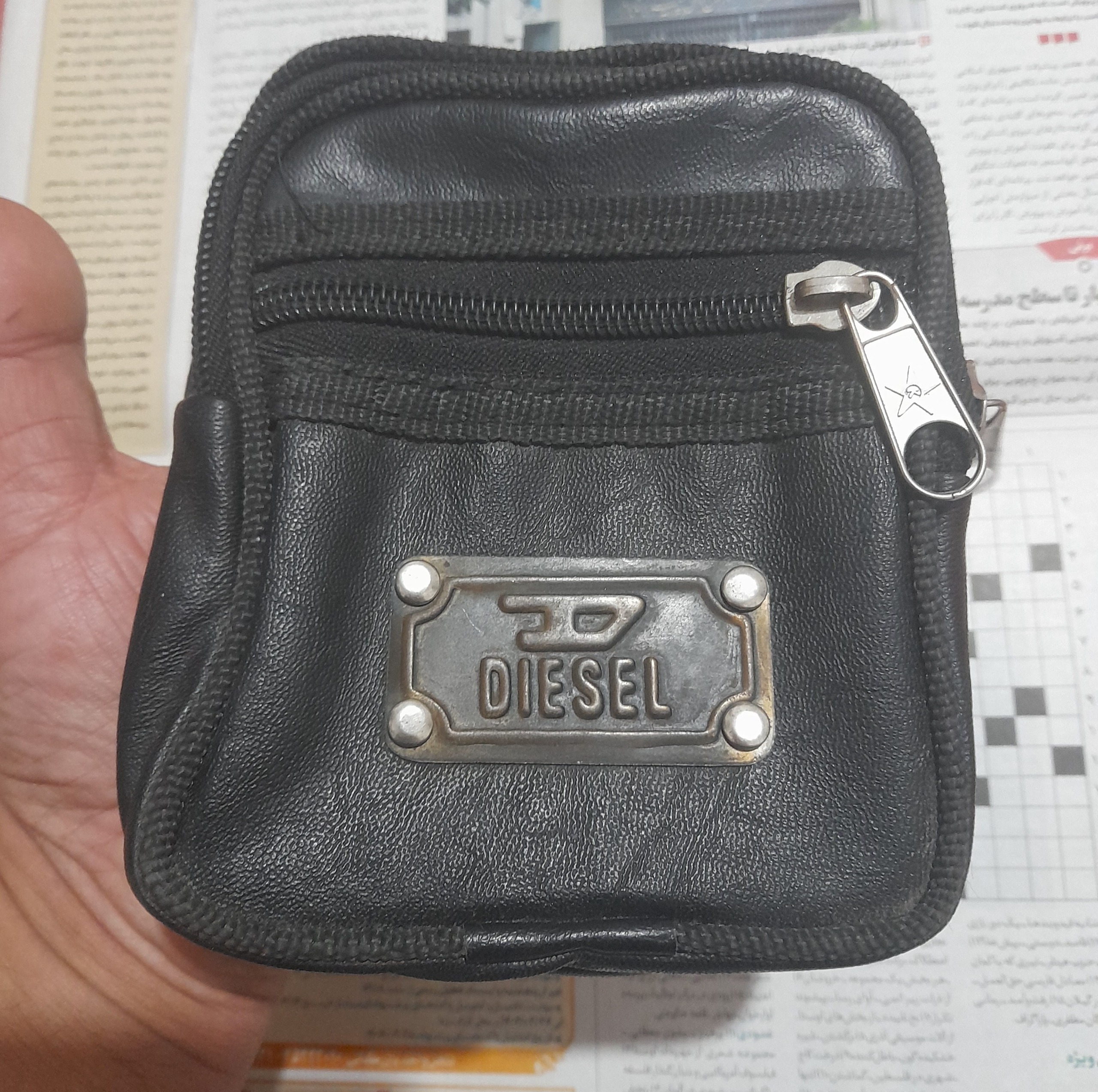 کیف چرمی دستی یا بغلی دیزل مطابق تصویر که میبیند از پشت کیف هم عکس گرفتم گذاشتم که ببیند جای داره که کمربند رو ازش رد مبکنید و بغل دست میشه و یا بصورت دستی برای راتنده های عزیزمون عالی هم مدارک یا پول میشه استفاده کرد