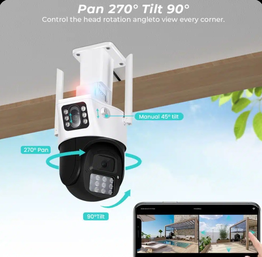 مینی اسپید دام دو دوربینه با توجه به 270 درجه افقی و 90 درجه عمودی، می توانید دوربین وای فای فضای باز را از راه دور کنترل کنید تا هر زاویه را از طریق تلفن همراه خود مشاهده کنید.