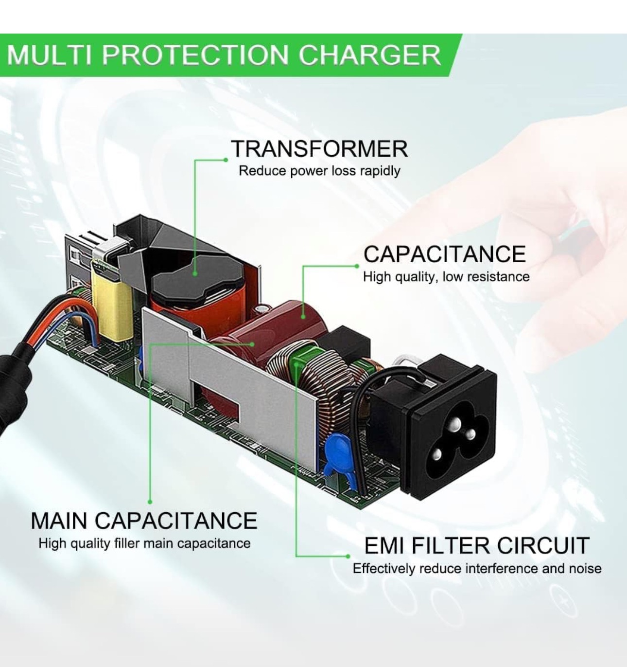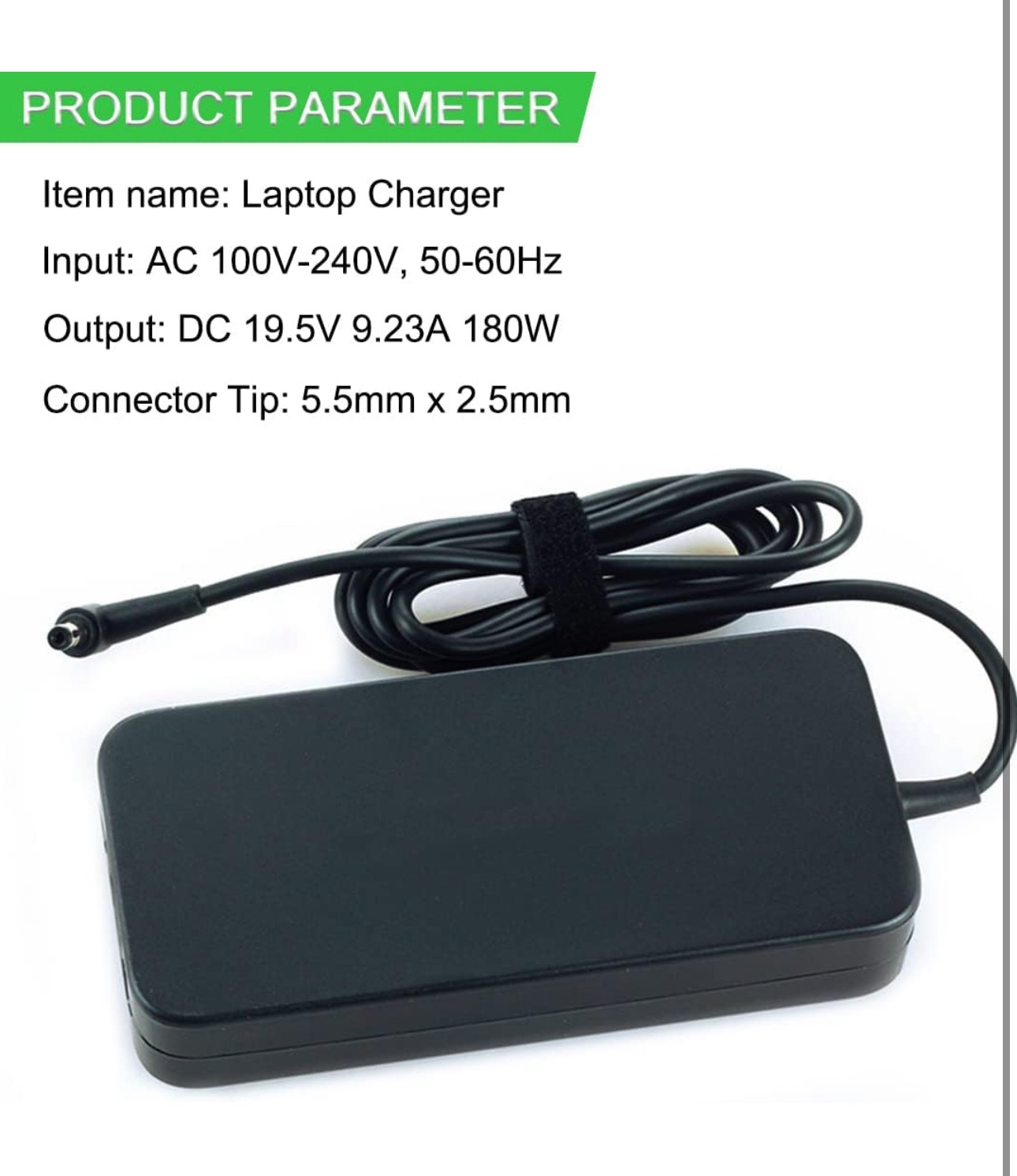 مشخصات ورودی: AC 100-240V 50-60Hz؛ خروجی: DC 19.5V 9.23A 180W؛ اندازه کانکتور: 5.5x2.5mm. (لطفاً به دادههای لینک شده توجه کنید! مراقب باشید!)