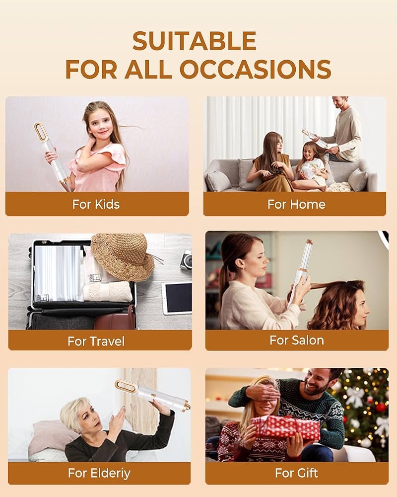 مجموعه حالت دهنده موی داغ 6 در 1: برس سشوار یک مجموعه حالت دهنده چند منظوره است که میتواند نیازهای مختلف شما را در مورد حالت دادن به مو به طور کامل برآورده کند. سشوار 6 در 1 شامل 1 سشوار، 2 فرکننده هوا در جهات مختلف، 1 برس گرد دمنده، 1 برس صاف کننده مو است. میتواند به عنوان سشوار، فرکننده مو، برس حجم دهنده، برس موی چتری و برس صاف کننده استفاده شود.