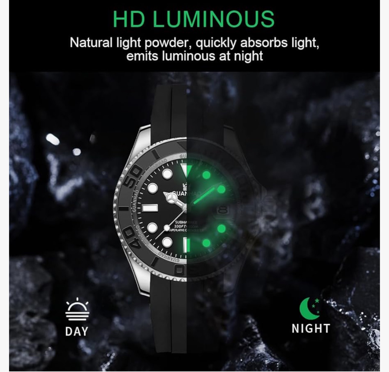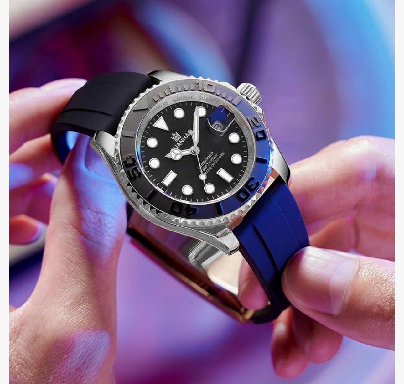 ساعت مچی اتوماتیک مردانه گوانهائو: ساعت مکانیکی خودکوک با تاریخ، قاب چرخان لوکس یک جهته، عقربه بزرگ شبنما و طراحی ضد آب.