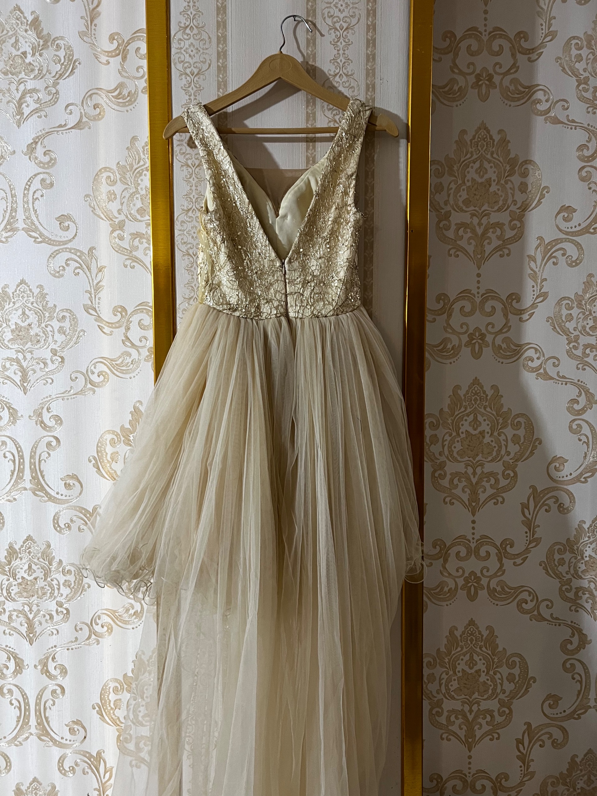 رنگ طلایی کوتاه یه دنباله ی بلند حریرم داره یک بار پوشیده شده بسیار تمیز و و در حد نو