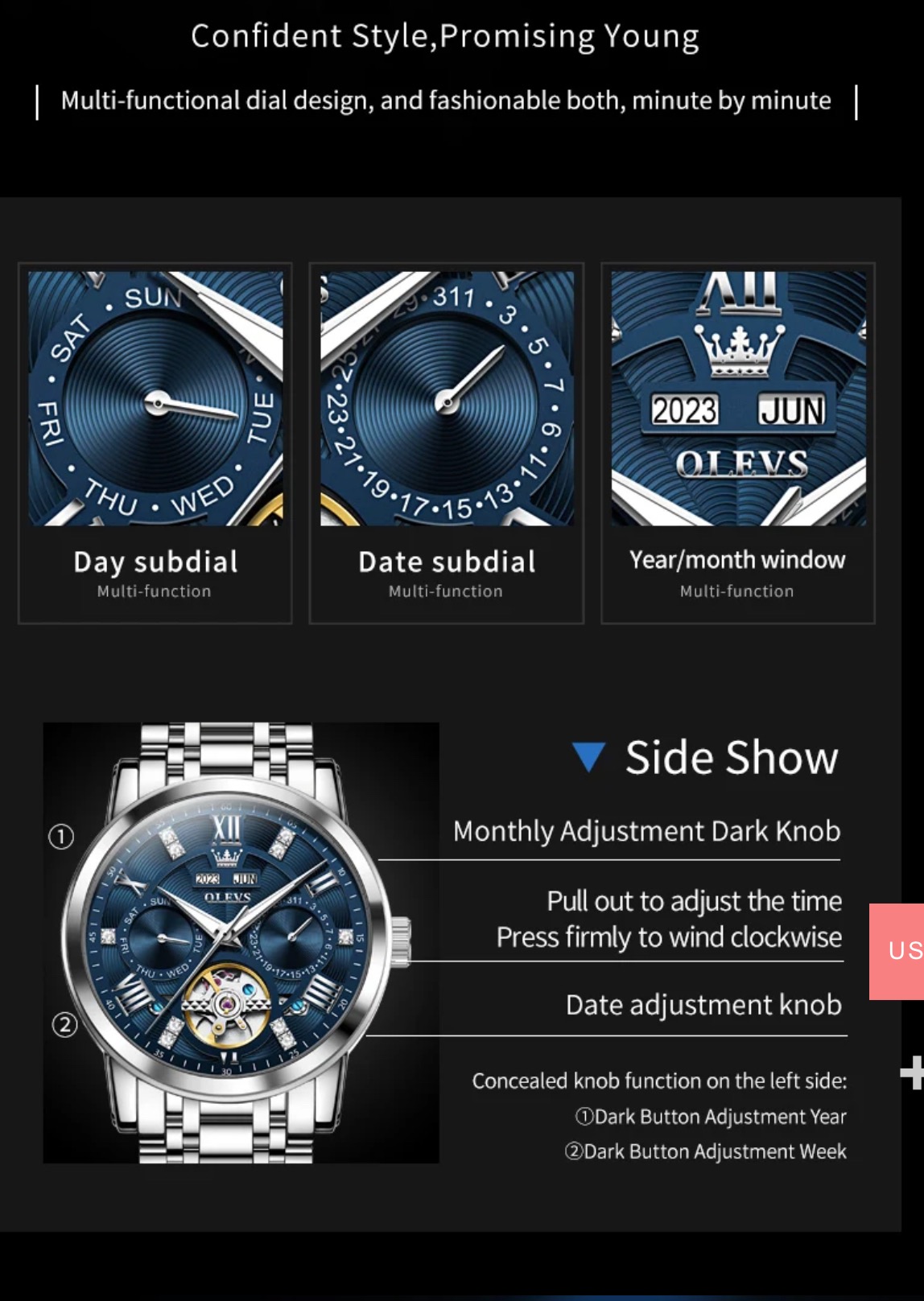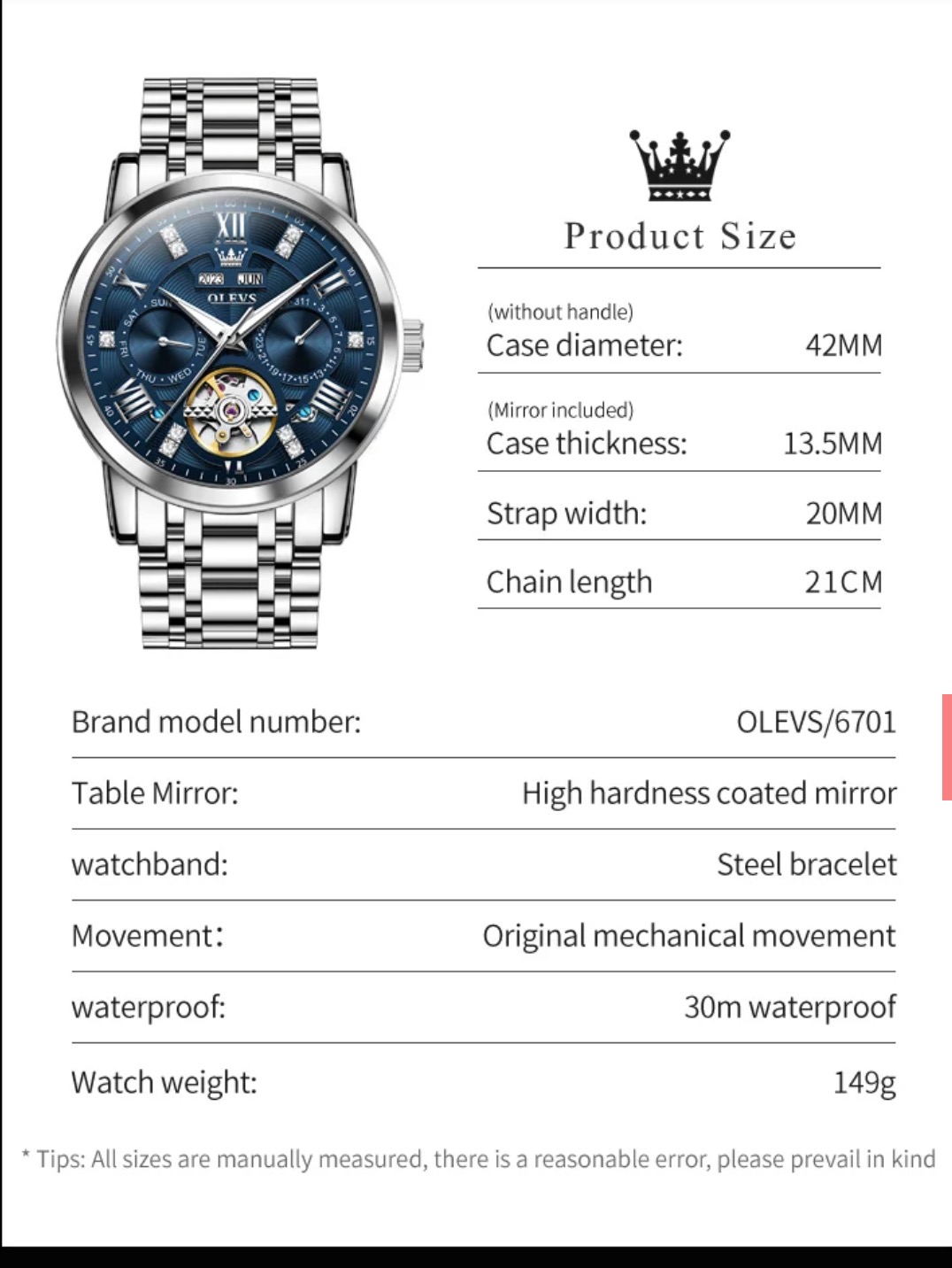 ساعت مچی مردانه اتوماتیک لوکس جدید OLEVS 6701 با بند فلزی و چرخ دنده، ساعت مچی مردانه اصل از جنس استیل ضد زنگ.