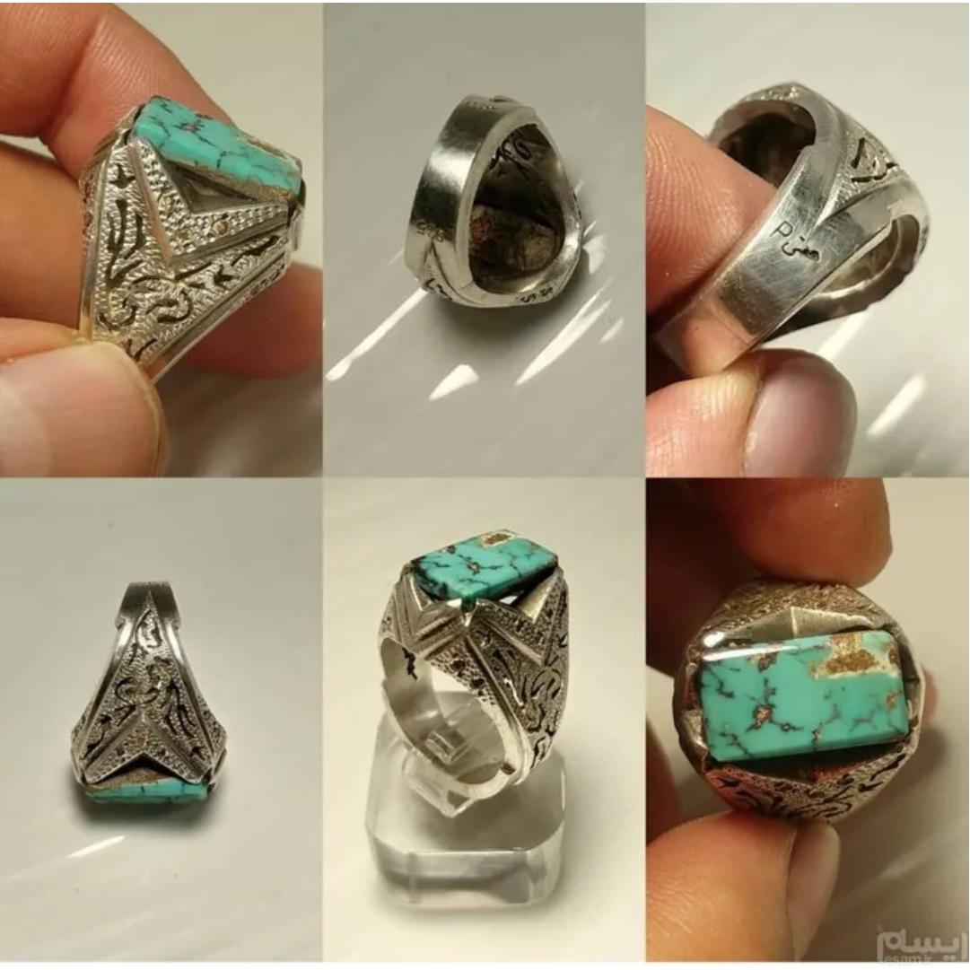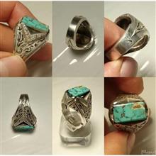 انگشتر نقره فیروزه درجه 1 نیشابوری سوار بر رکاب دستساز مخراج کاری شبکه کاری دقیق و خاص با مهر سازنده