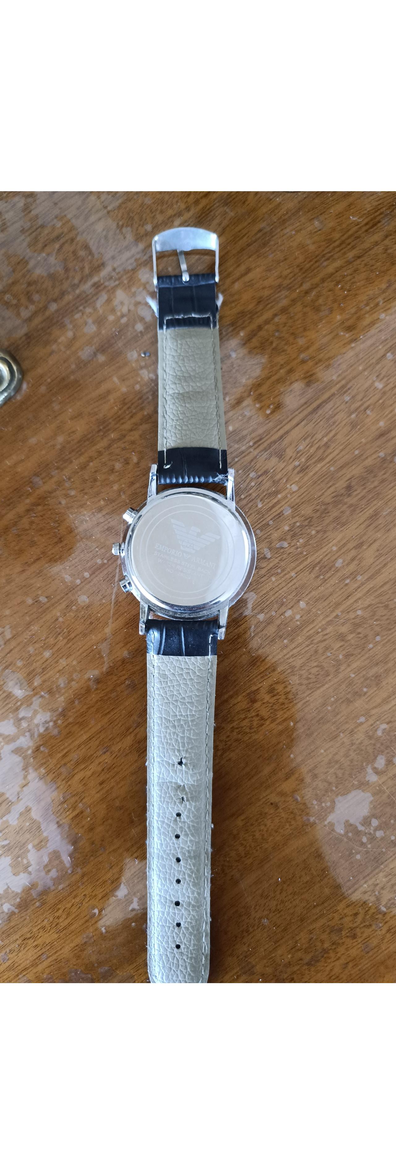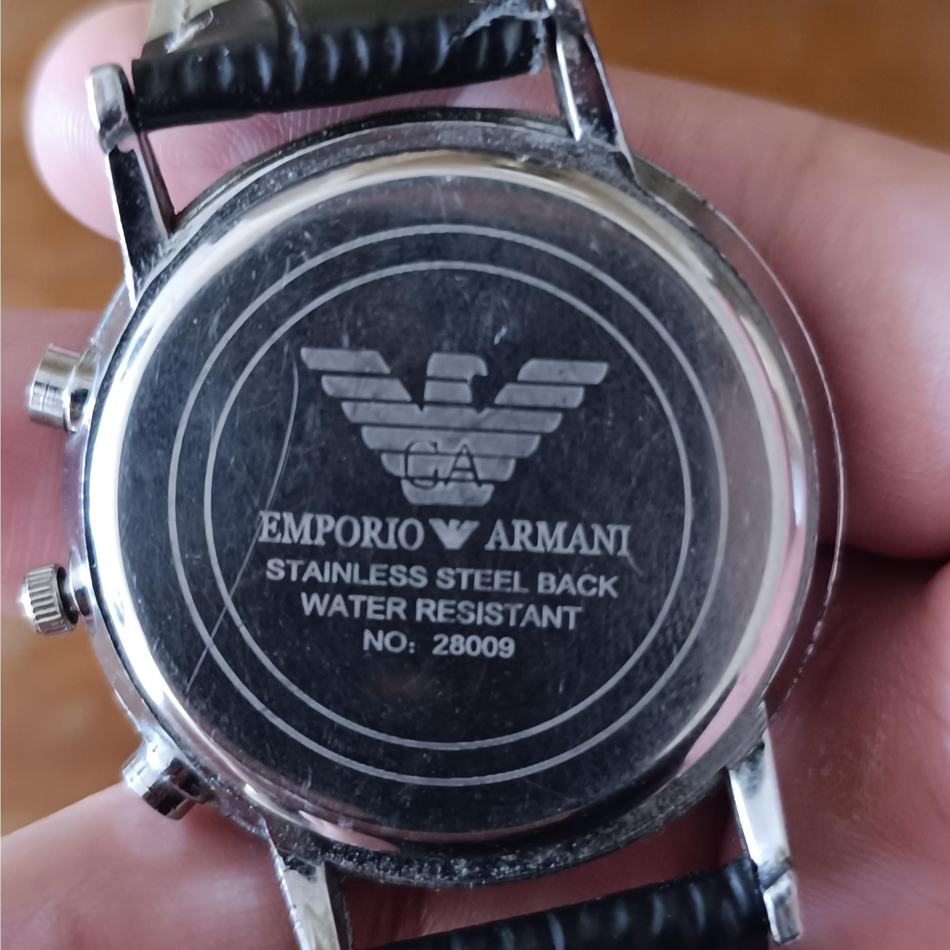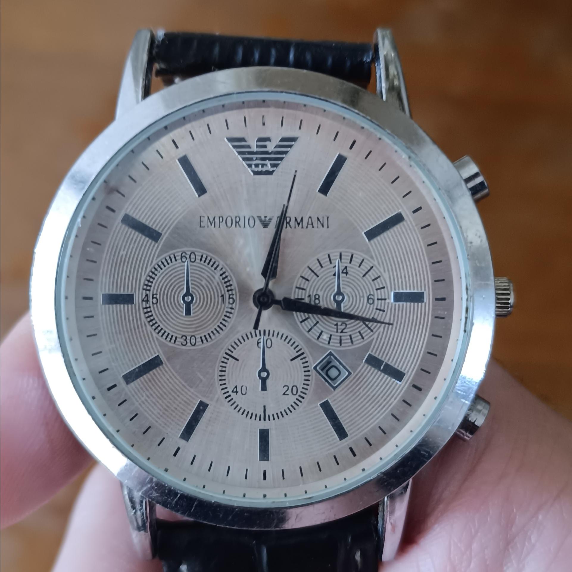 ظاهر شیک و مینیمال با جزئیات کرنوگراف و بند چرمی که حس کلاسیک و رسمی القا میکند. لوگوی بزرگ Armani توی صفحه یعنی نگاهها رو جلب میکنه.