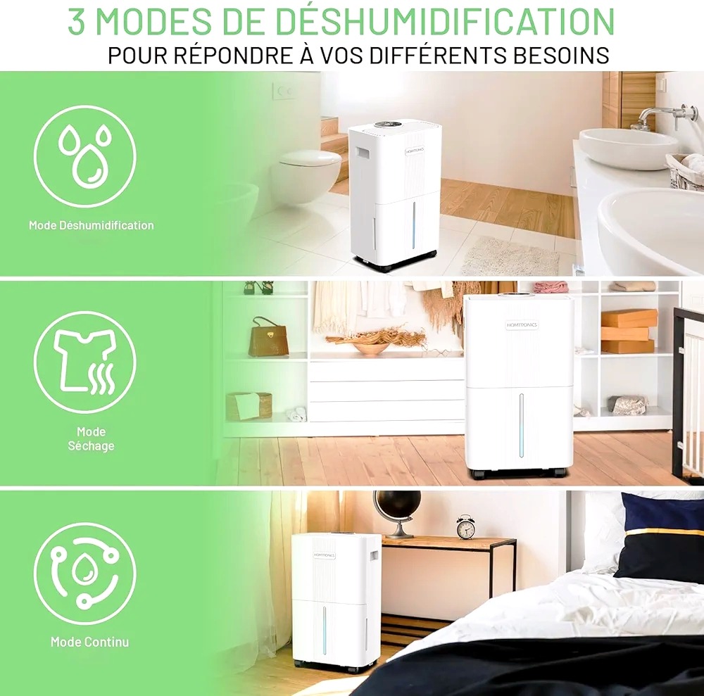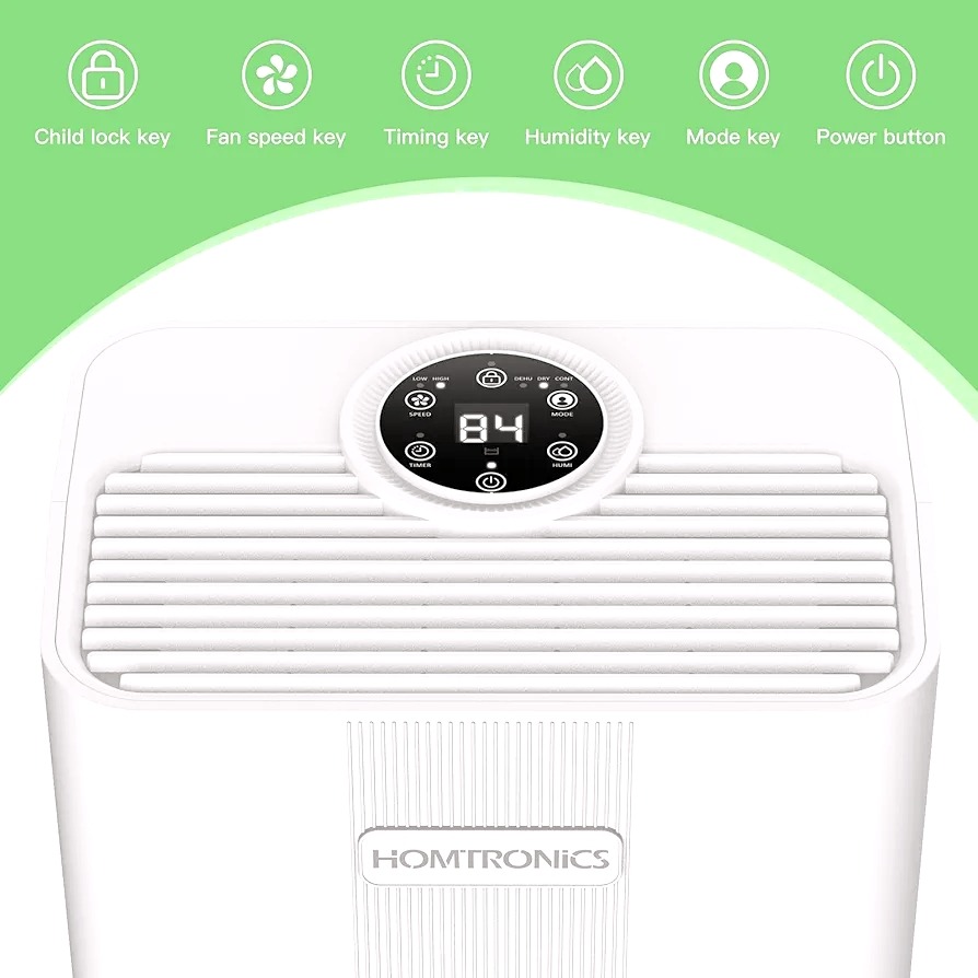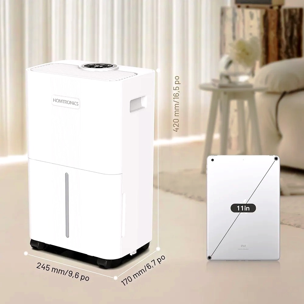 رطوبتگیر با راندمان بالا برای 1500 متر مربع: رطوبتگیر Homtronics که با یک کمپرسور با کارایی بالا کار میکند، روزانه تا 21 پیمانه رطوبت (35 درجه سانتیگراد، 90 درصد رطوبت نسبی) را از بین میبرد و آن را برای فضاهایی به کوچکی 0.1 متر مربع ایده آل میکند. چه در