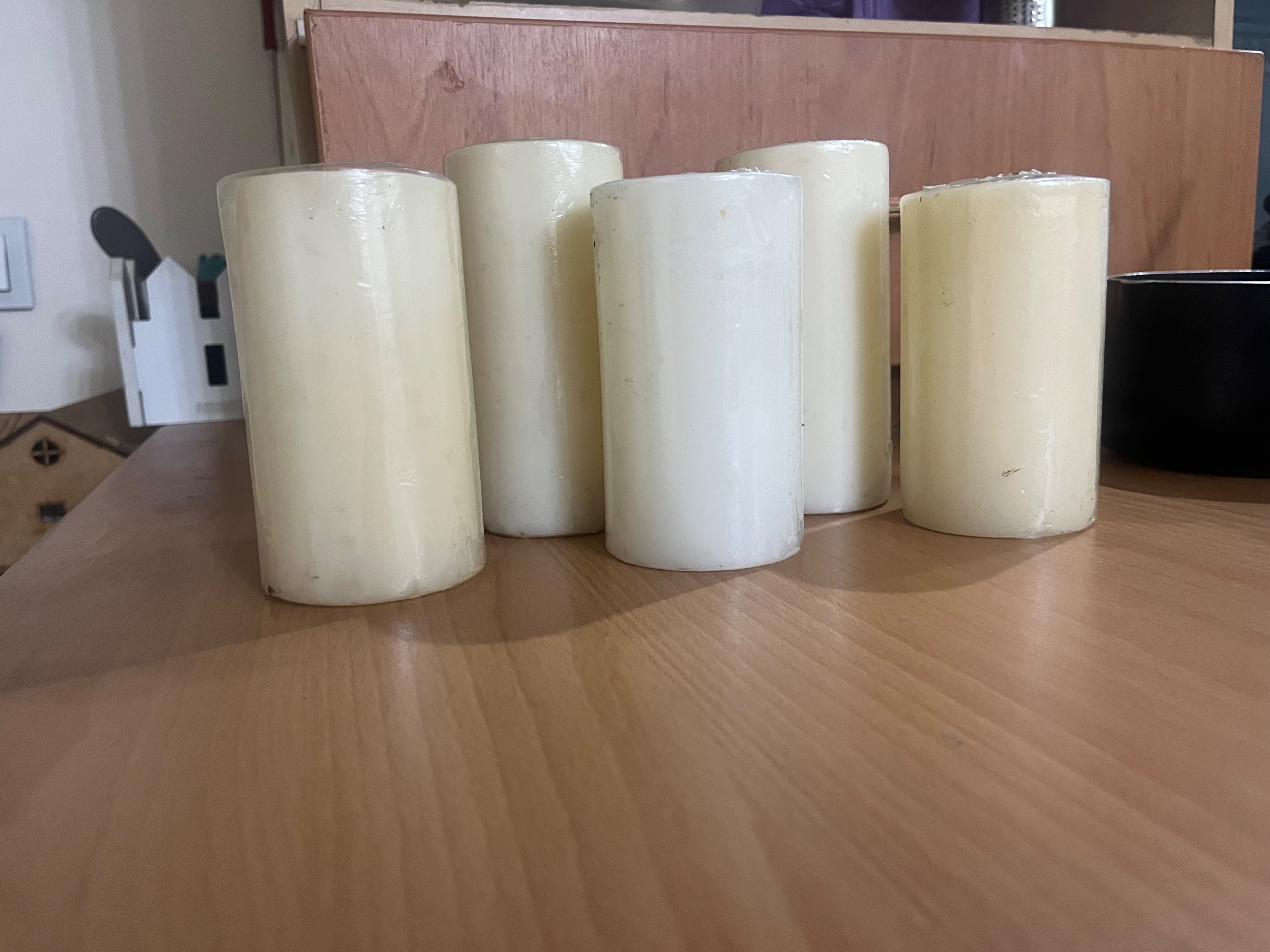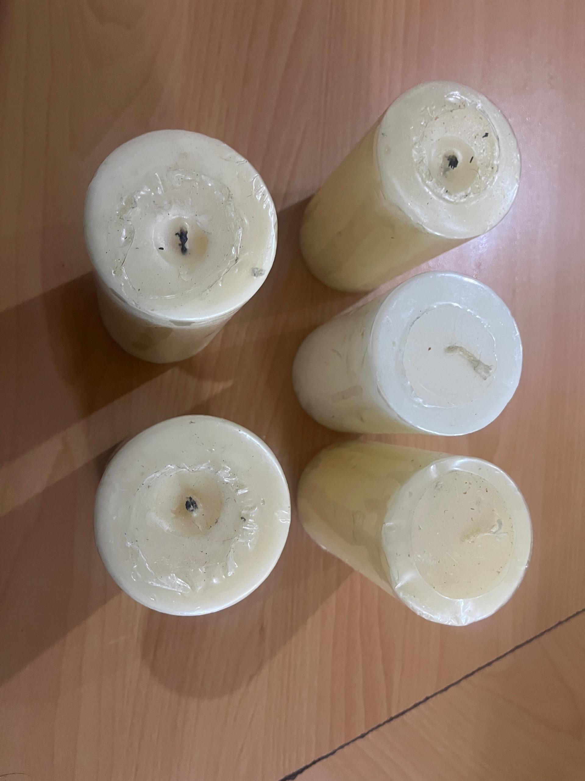 5 عدد شمع ساده و کلاسیک همراه با طلق دورش مناسب برای تزئین خانه و سفره و مجلس دو عدد بلند به ارتفاع 14 سانت و قطر 6/5 سانت که یکبار فقط روشن شدند