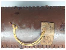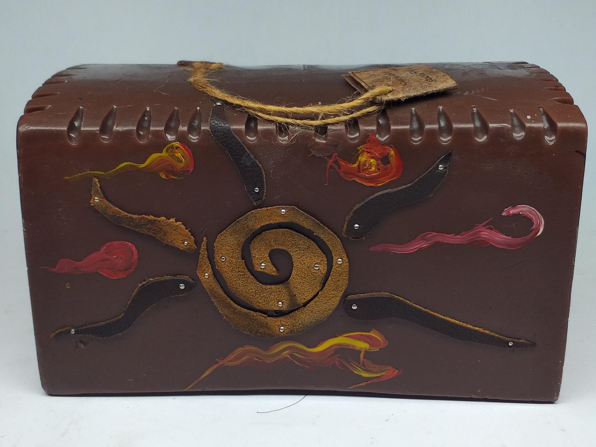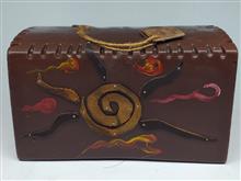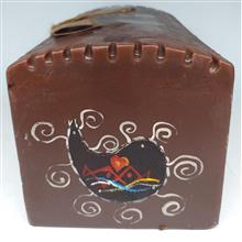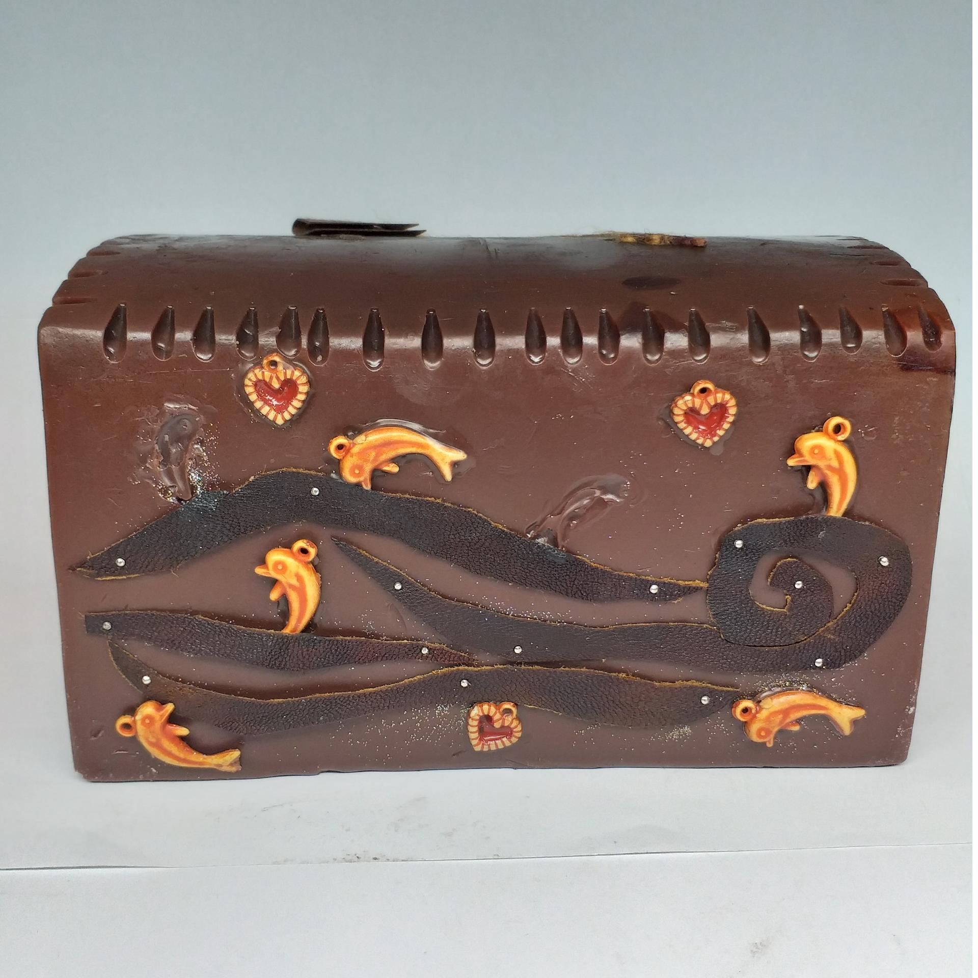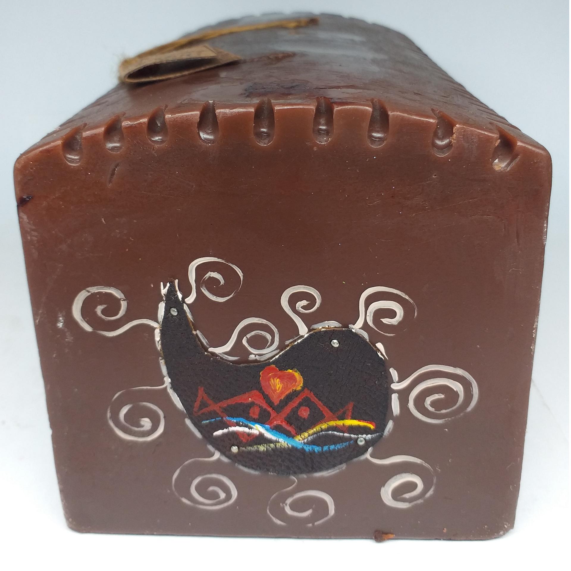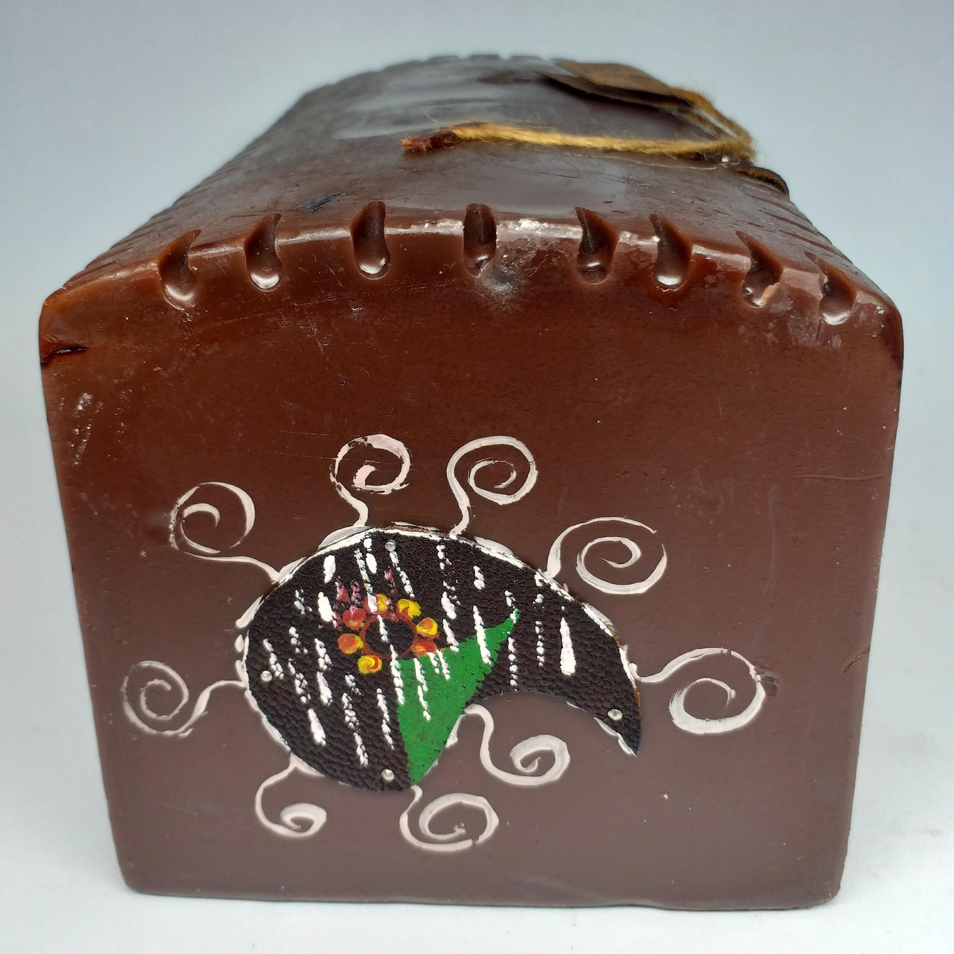 شمع دکوراتیو خاص و متفاوت به شکل صندوقچه، ساخته شده از پارافین فشرده سنگین با تزئینات چرمی.