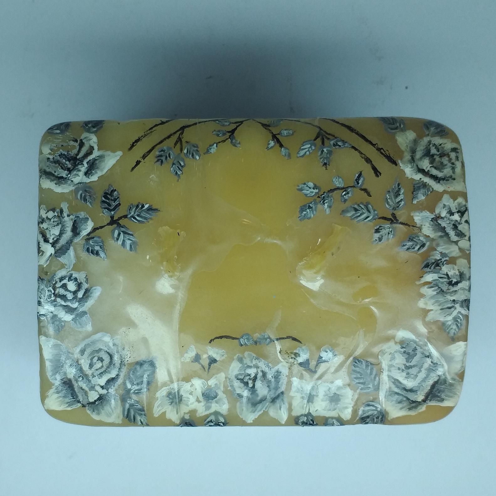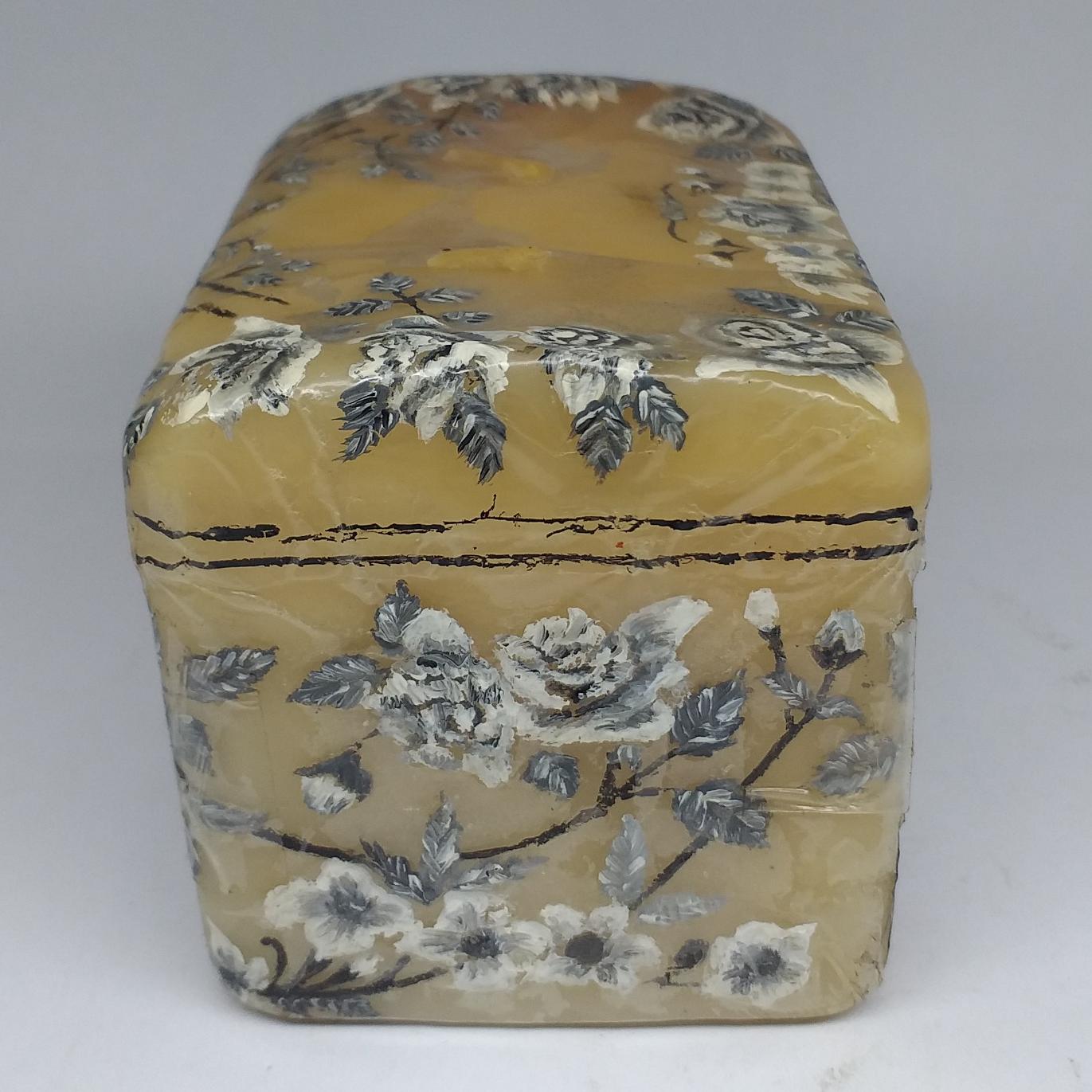 شمع دکوراتیو خاص و متفاوت به شکل صندوقچه، ساخته شده از پارافین فشرده سنگین با تزئینات نقاشی.