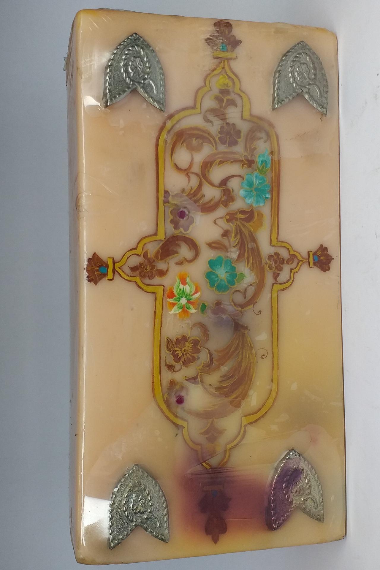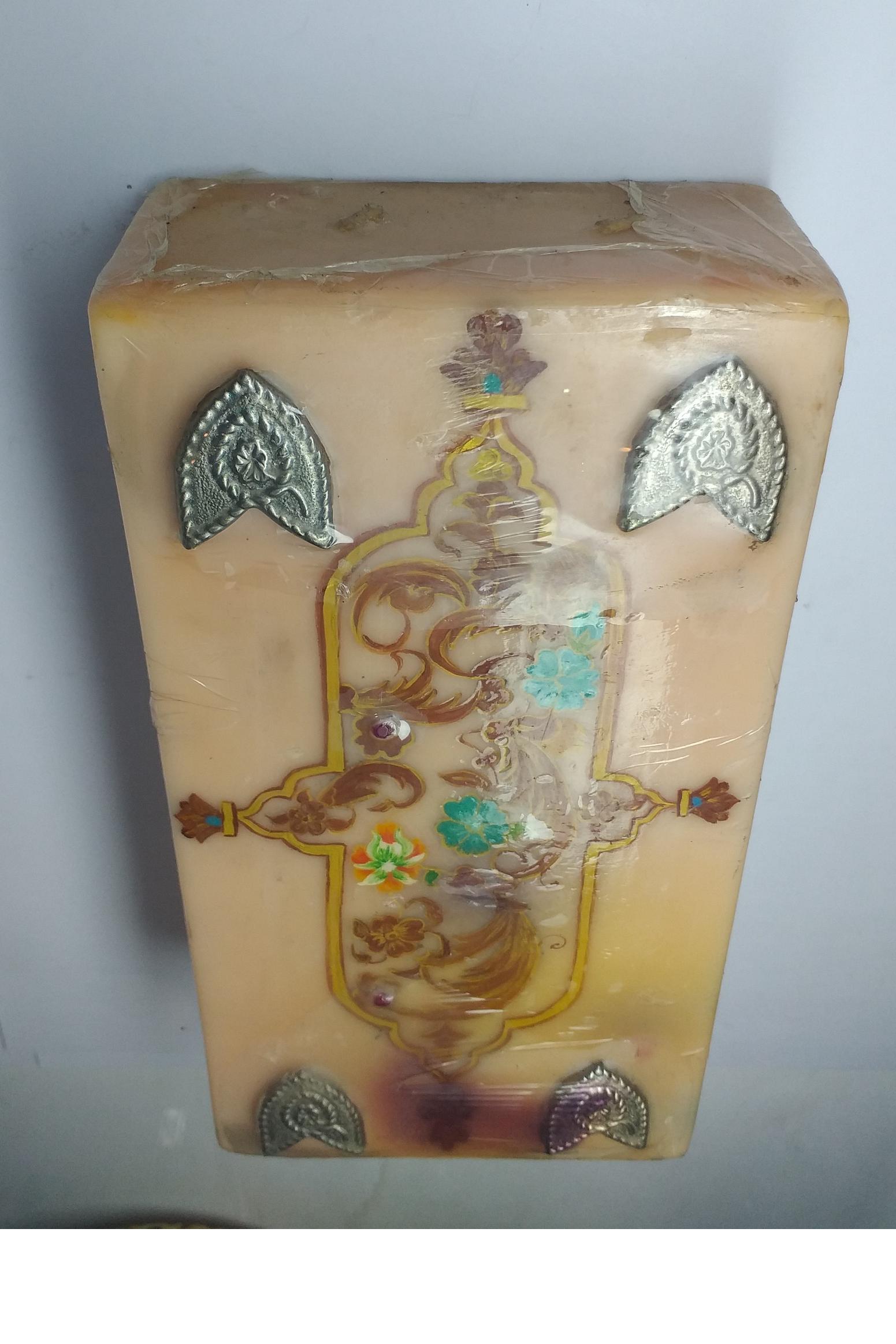 شمع دکوراتیو خاص و متفاوت به شکل مکعب مستطیل، ساخته شده از پارافین فشرده سنگین با تزئینات فلزی و نگین دار.