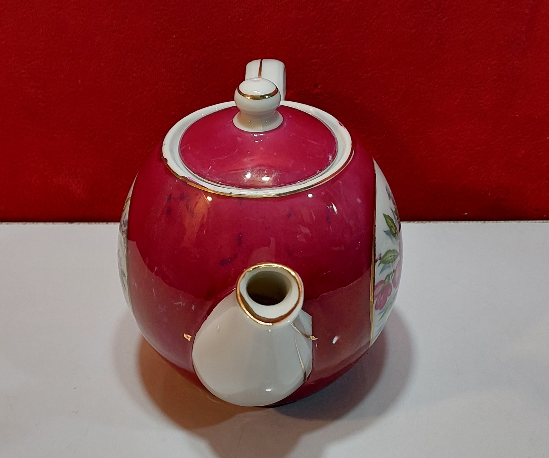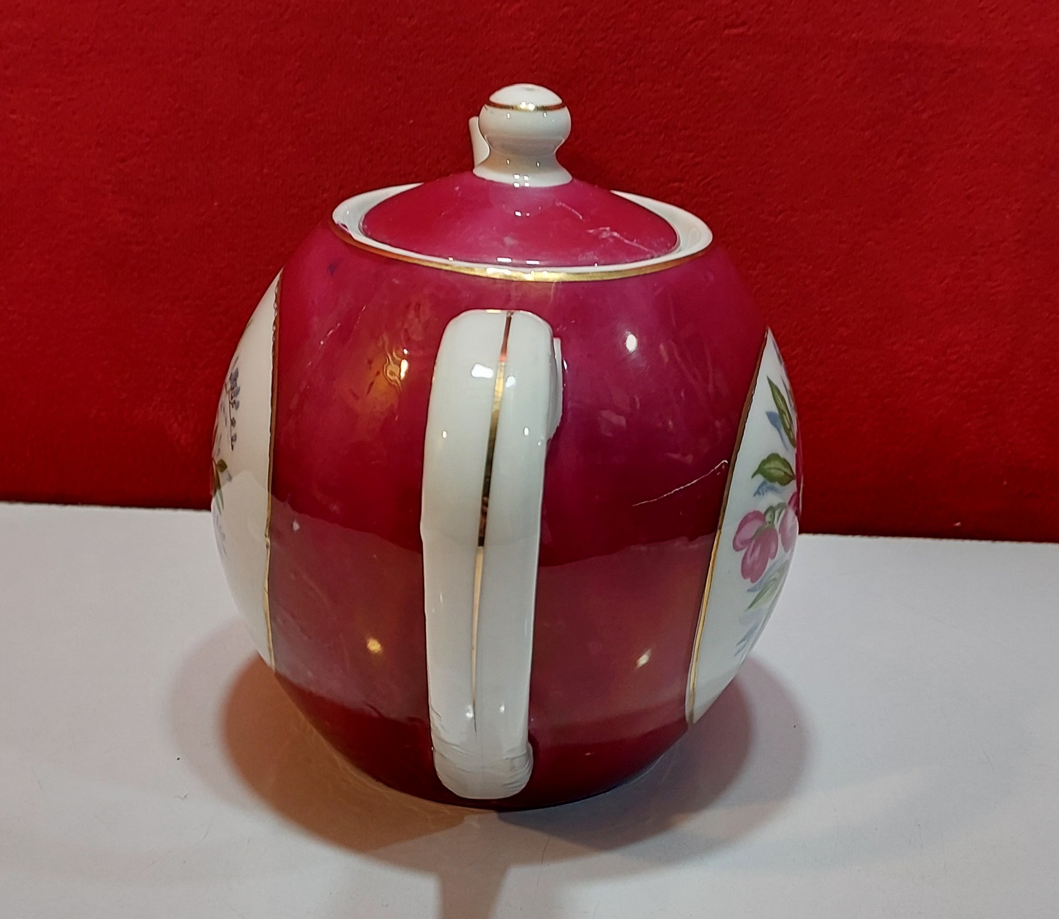 ساخت قدیم کشور ژاپن با سایز متوسط اصلی سالم استفاده نشده طبق تصاویر لطفا دقت فرمائید فقط رنگ زرشکی کامل یکدست نیست و خط و نقطه های سفید رنگ داخلش دیده میشه که دیگه از اول اینجوری بوده و بعلت قدمتش هست.