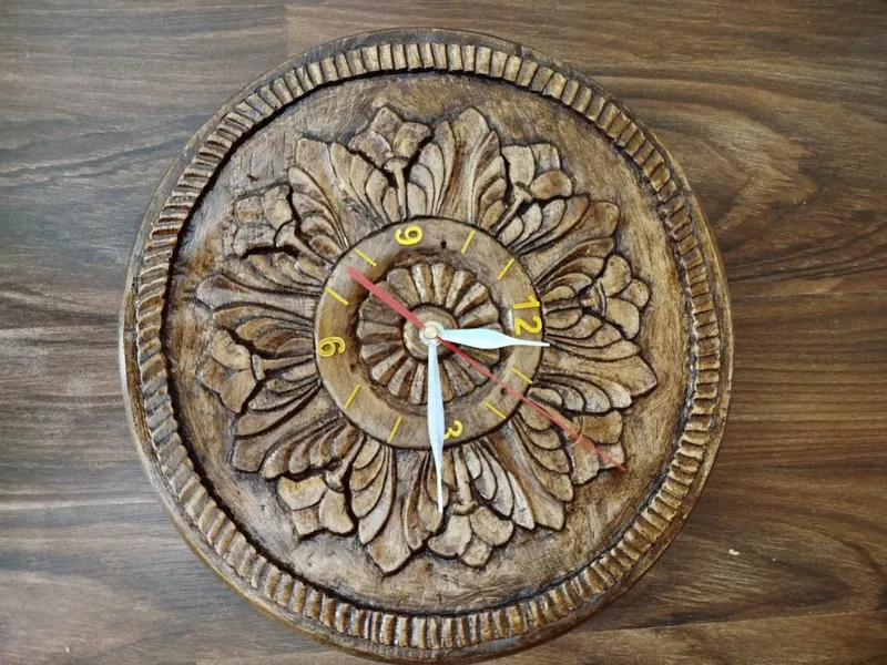 ساعت دیواری چوبی منبت کاری شده طرح گل و برگ پیچیده می باشد.