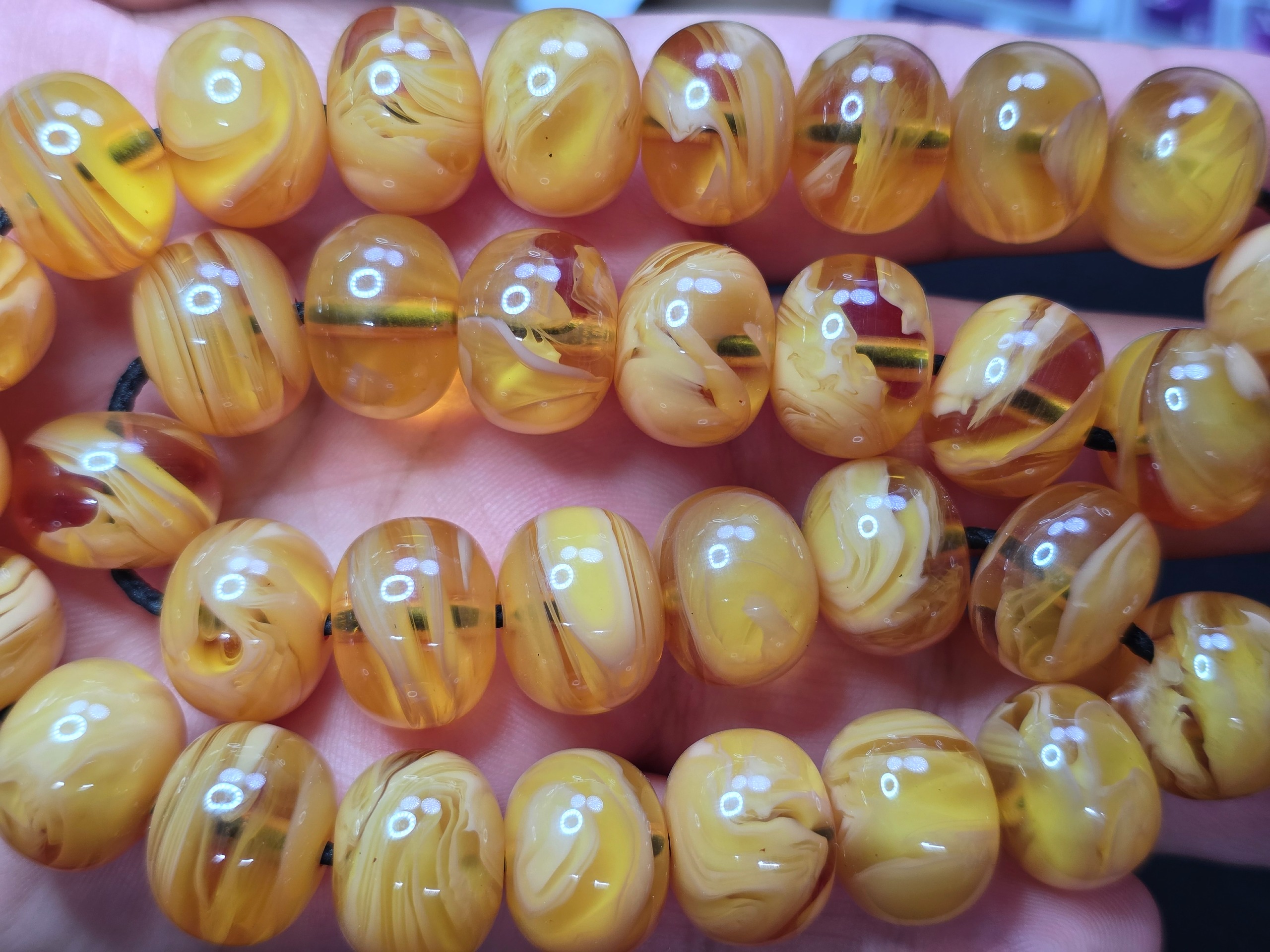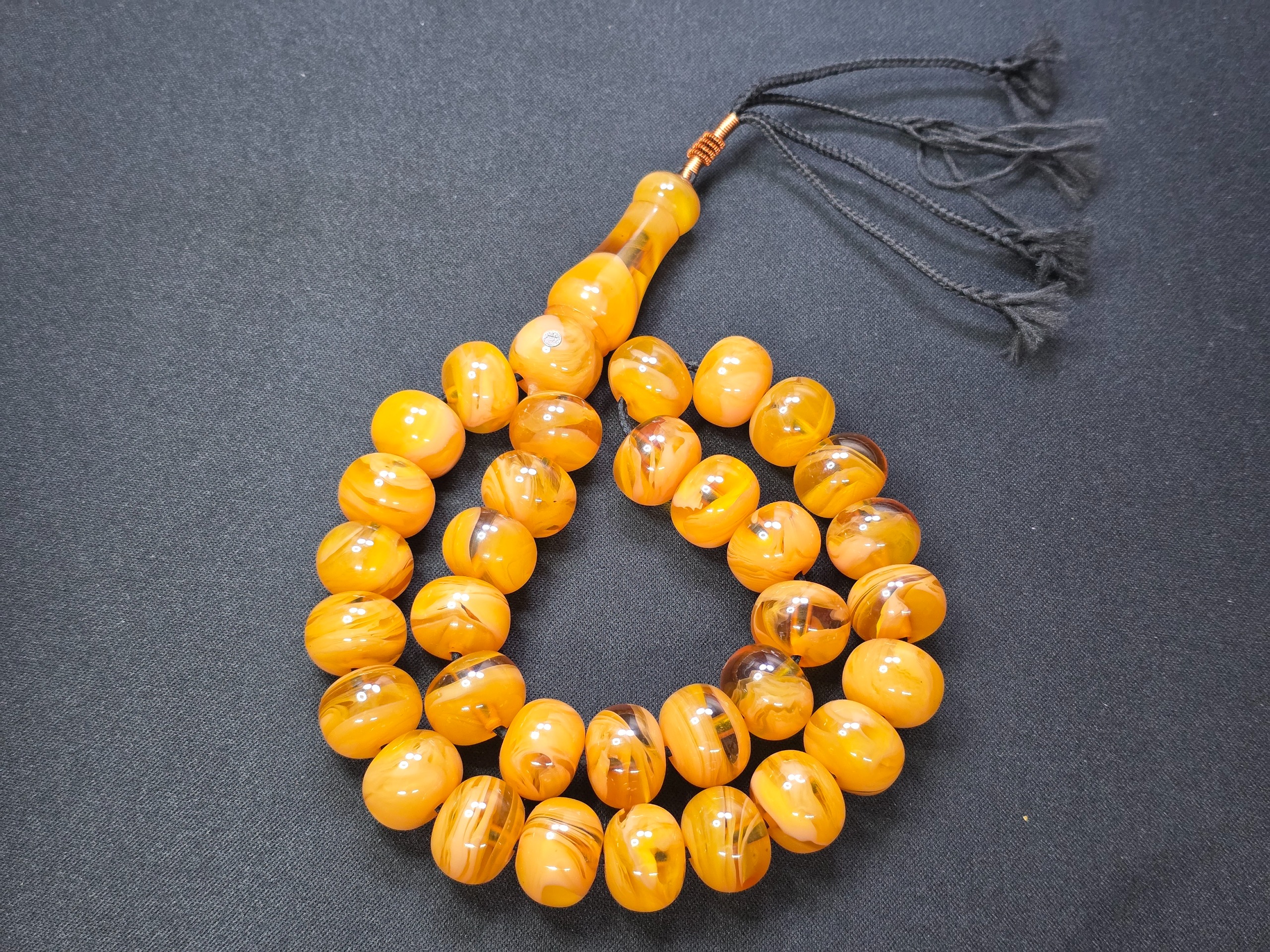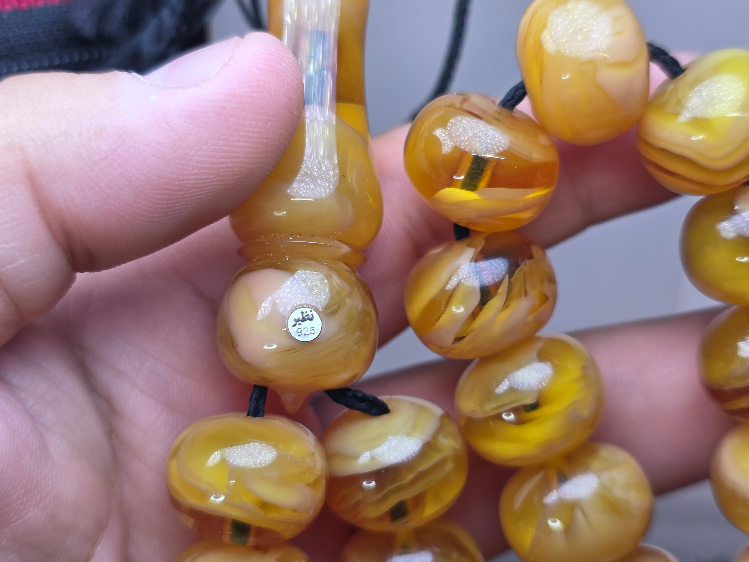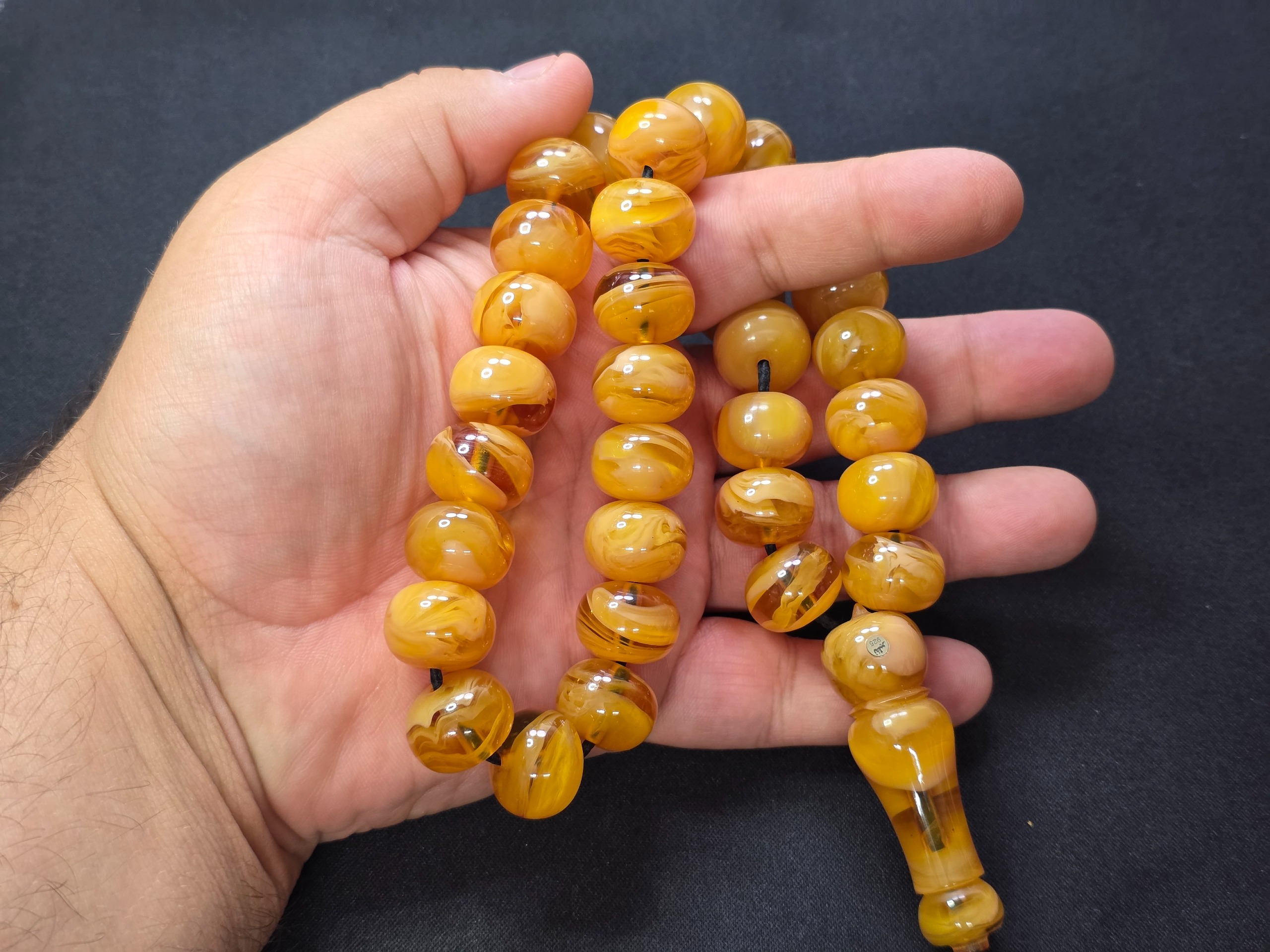 تسبیح دانه درشت و غولپیکر سایز 18کهربای پرچمی زرافشان ناب لهستان درجه یک با مهر نقره کوب 925 سازنده استاد نظیر بسیار منحصر به فرد و کمیاب مهر نقره کوب استاد نظیر که روی هر تسبیحی بیاد فقط 3 الی 5 میلیون قیمت اون تسبیح رو بالا میبره