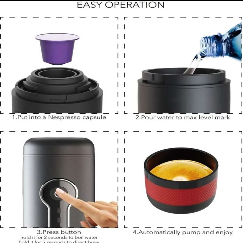 یک دستگاه کوچک و قابل حمل که قابلیت شارژ شدن دارد و به صورت اتوماتیک یک فنجان اسپرسو آماده می نماید. این قهوه ساز شارژی را هم میتوانید به وسیله شارژ آن در منزل و محل کار شارژ نماید و هم به وسیله آدابتور مخصوص شارژ فندکی ماشین باتری آن را شارژ نموده و در سفر و در خودرو و محل کار و غیره استفاده کنید.
