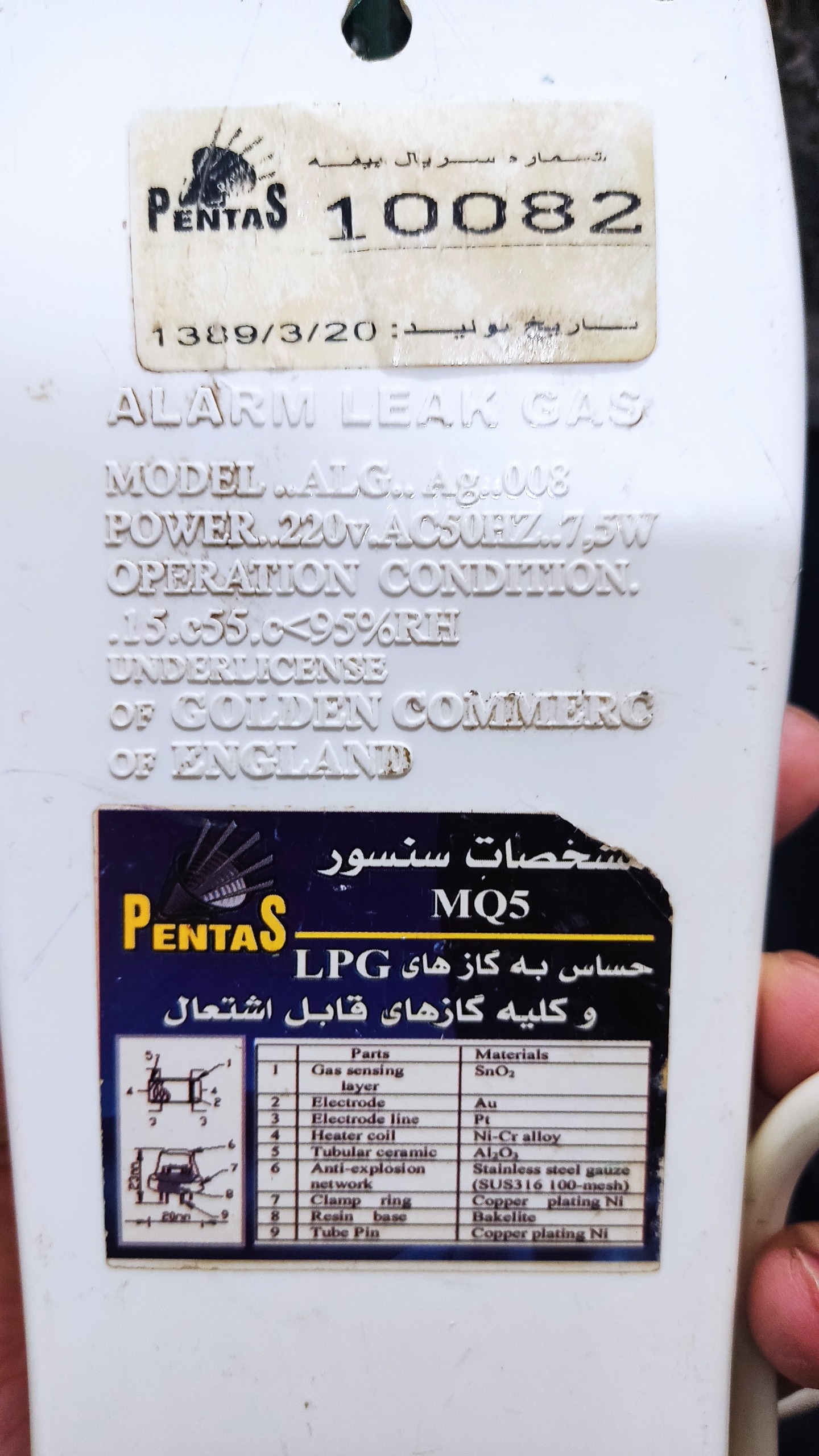 دستگاه اعلام نشت گاز کاملاً سالم و با کیفیت جنس قدیمی که در ابتدا که به برق زده میشه چراغ پاور به عنوان روشن بودن دستگاه روشن میشه و بعد از مدتی چراغ زرد رنگ به عنوان اکتیو یا فعال بودن دستگاه روشن میشه و بعد از اینکه نشتی گاز توسط دستگاه احساس شد چراغ قرمز رنگ روشن میشه و شروع به بوق زدن مداوم میکنه...