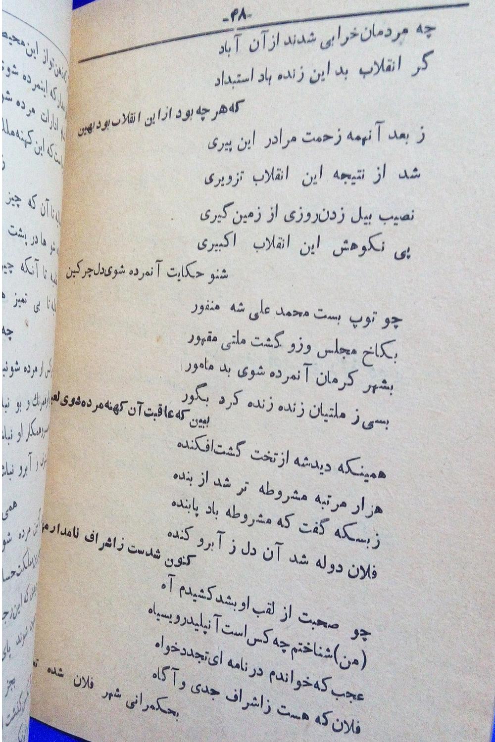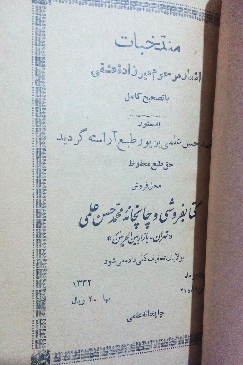 منتخبات اشعار شاهزارده میرزاده عشقی که توسط محمدحسن علمی به تاریخ 1332 به زیور طبع آراسته شده . بلحاظ جلد و عطف مطابق تصاویر . صفحات داخل دو صفحه مقداری از چاپ از پشت صفحه هم رویت میشه و پارگی کوچکی خارج نوشته تو یک صفحه هستش که چسب نخورده . در مجموف صفحات داخل با قدمت بالای 70 سال در وضعیت عالی