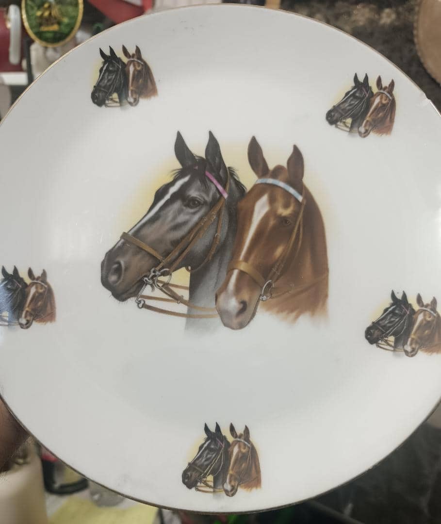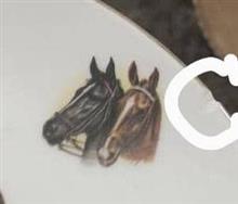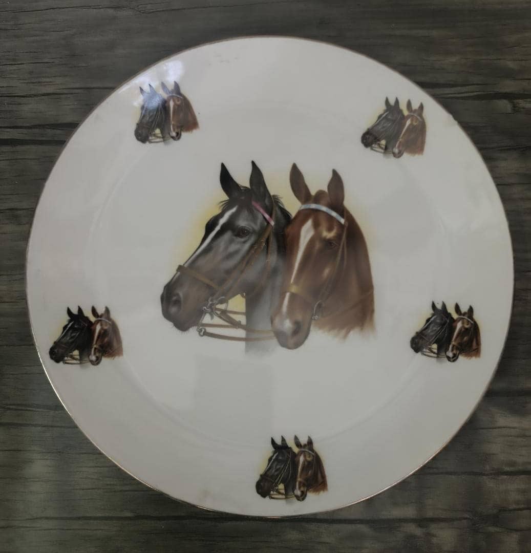 بشقاب دیوار کوب 26 ، طرح دو اسب ، قدیمی ، پهلوی ، جس چینی ، یه لب پری کوچک که در تصویر مشخص شده ، کیفیت و ابعاد مطابق تصویر