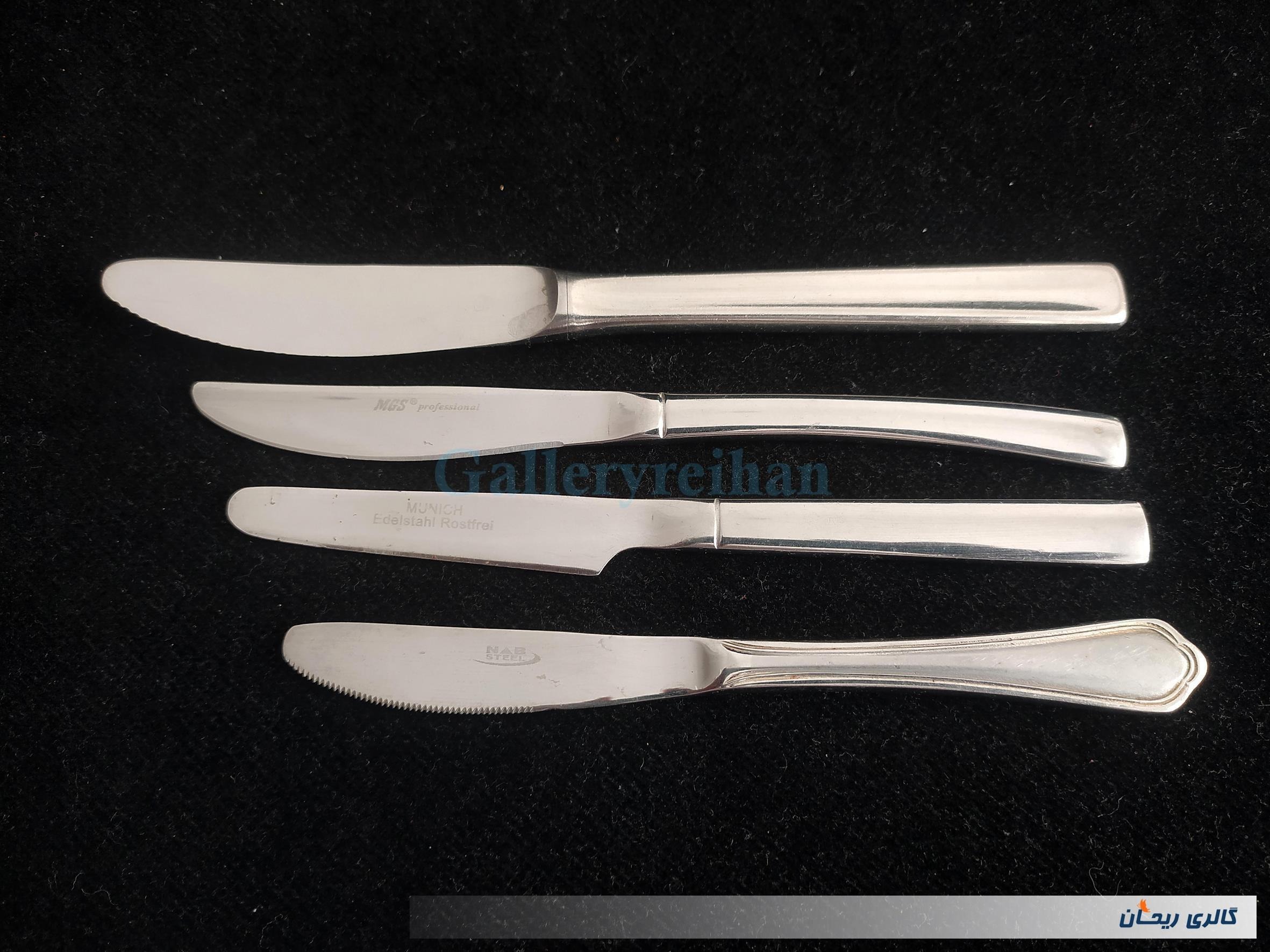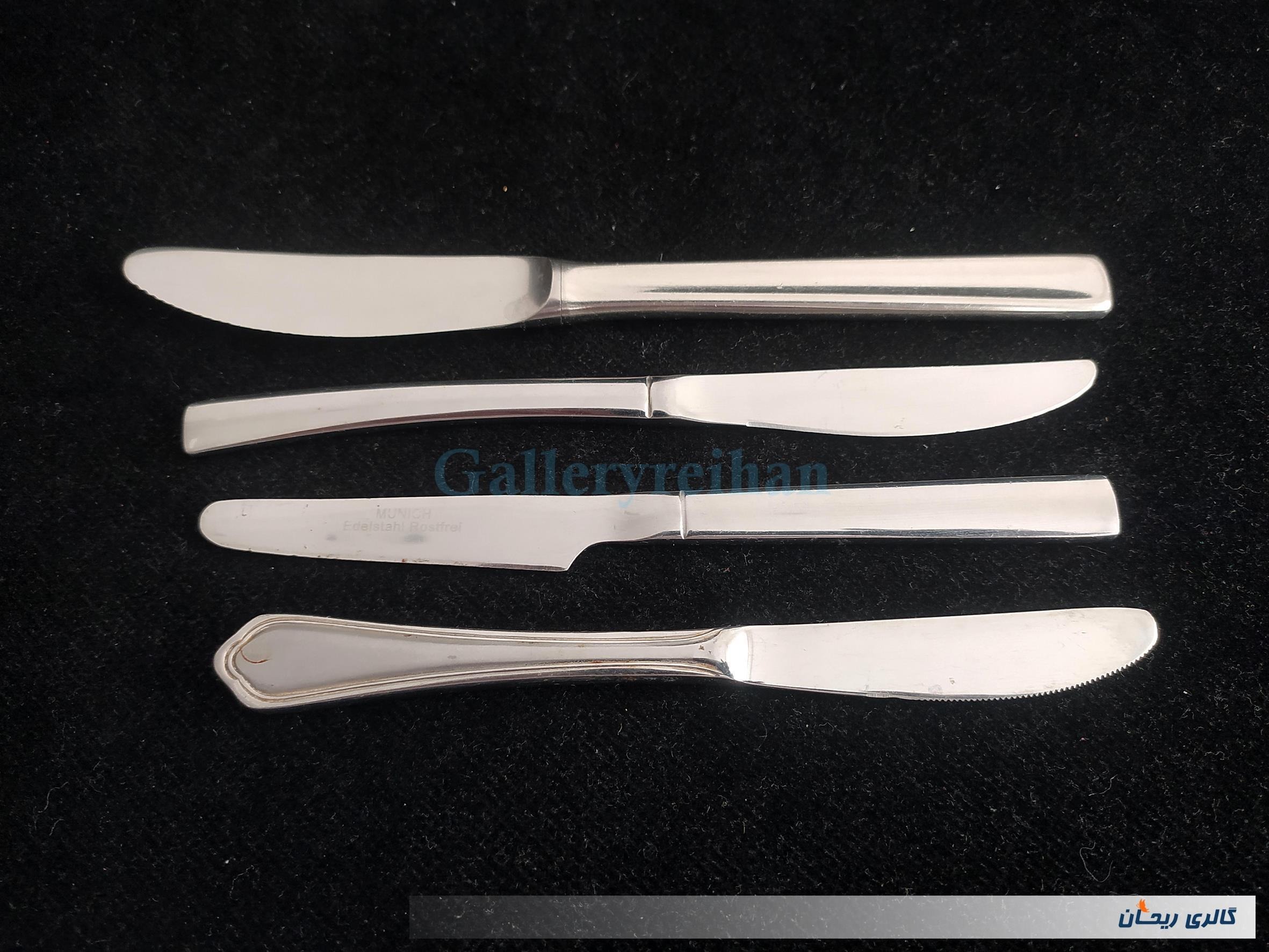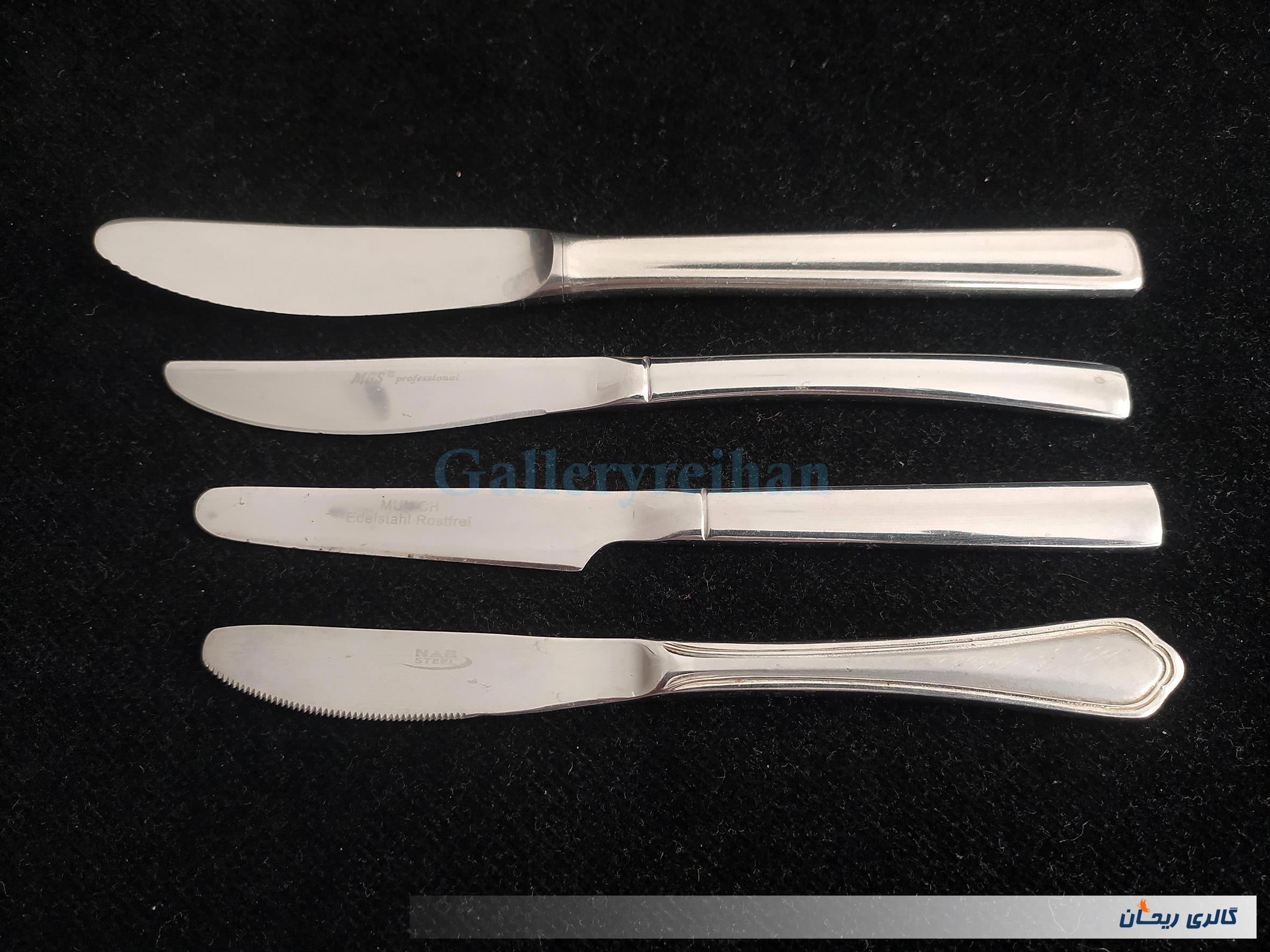 دسته چاقوی بزرگ تو خالی و پر شده از مواد است و صدا می دهد و دسته جذب آهنربا نمی شود و تیغه آن کج می باشد سه عدد چاقوی دیگر دسته تو پر می باشند و جذب آهنربا می شوند و به علت قدیمی بودن کمی خط و خش دارند و قیمت هم بر همین اساس قرار داده شده است.