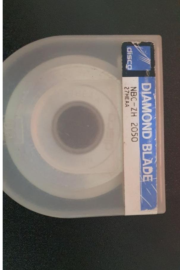 تیغههای الماس الکتروفرم شده برای برش و شیار زدن ویفر سیلیکونی و سایر مواد، مدل دیسکو: NBC-ZH، شماره قطعه: 2050، 27HEBB. قطر خارجی 55.56 میلیمتر، شناسه 19.05 میلیمتر، عرض برش 0.020 تا 0.025 میلیمتر، حداکثر عمق برش از 0.51 تا 0.64 میلیمتر. گریت: سایز #2000 (2/4 um).