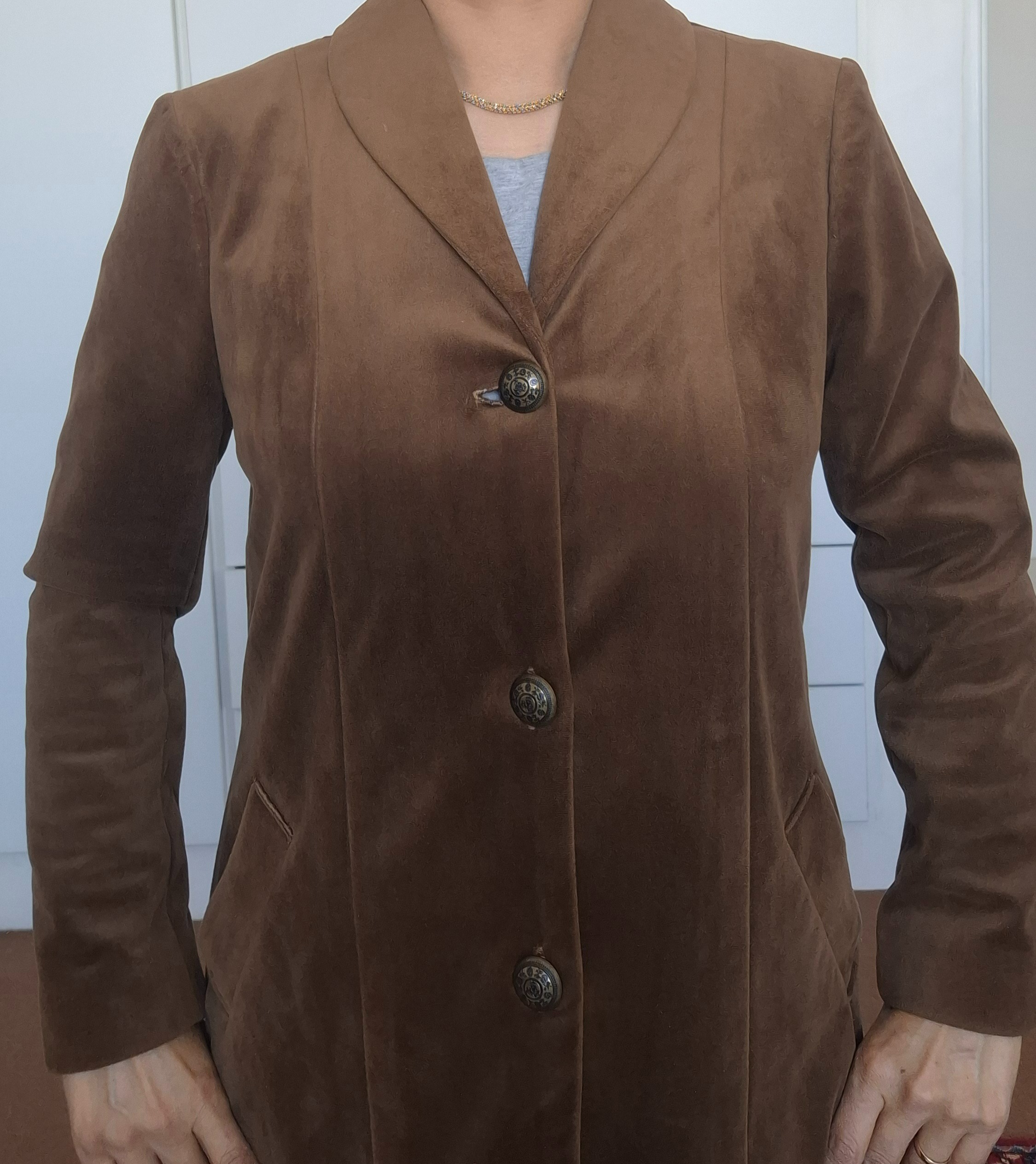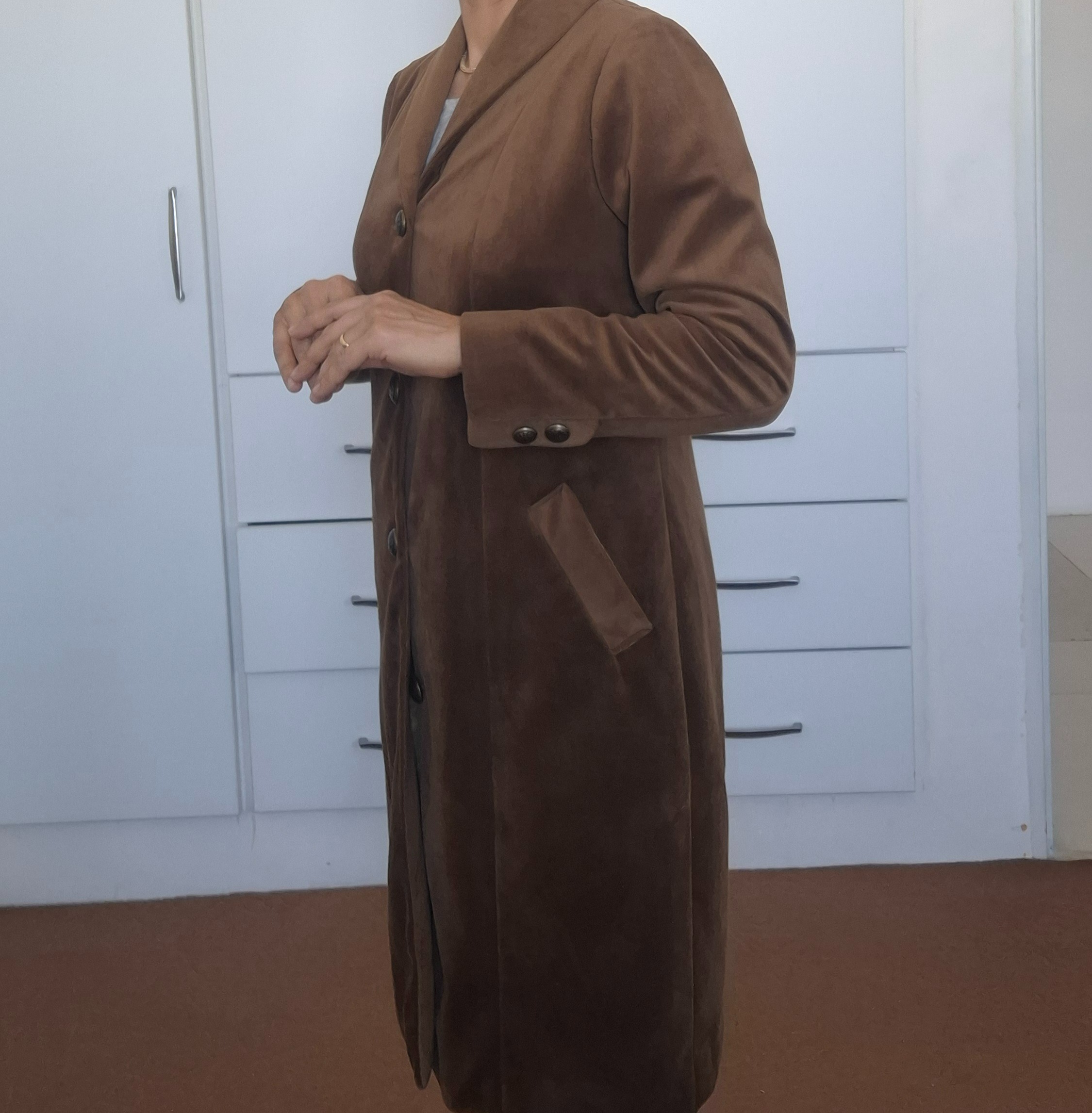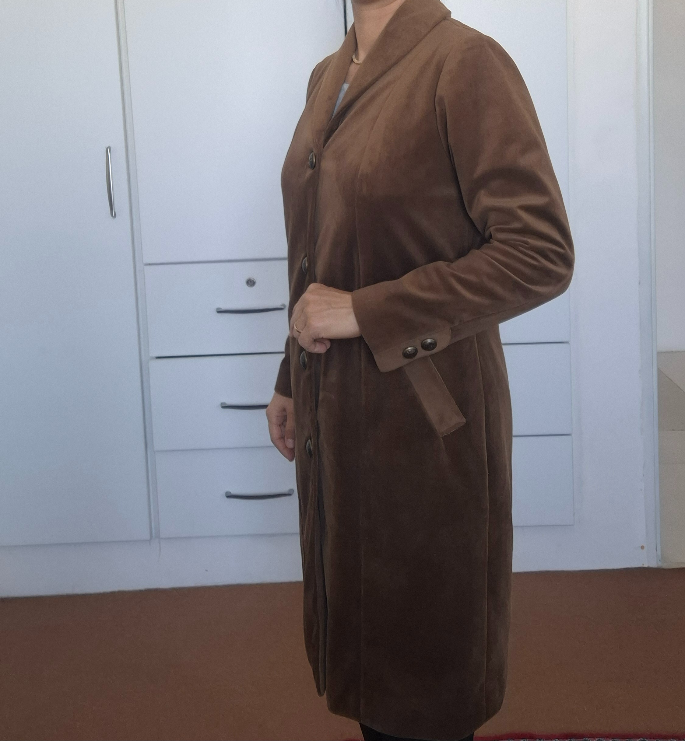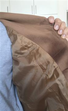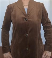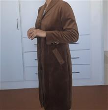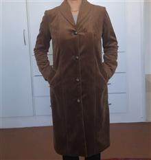 پالتو زنانه رنگ قهوه ای، جنس مخمل کوبیده، دست دوز. جلو دکمه دار، دارای دو جیب کاربردی، یقه آرشال، جلوو پشت برش دار است. داخل پالتو و آستین ها کاملا آسترکشی شده است