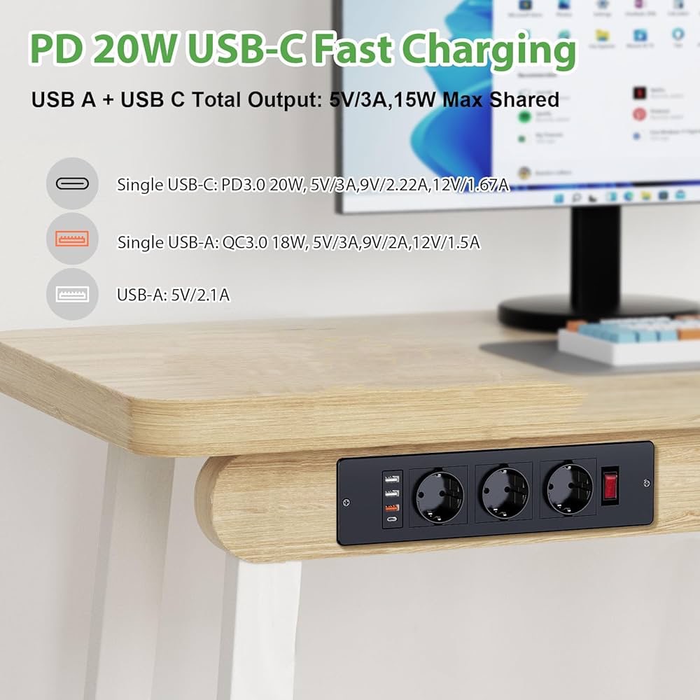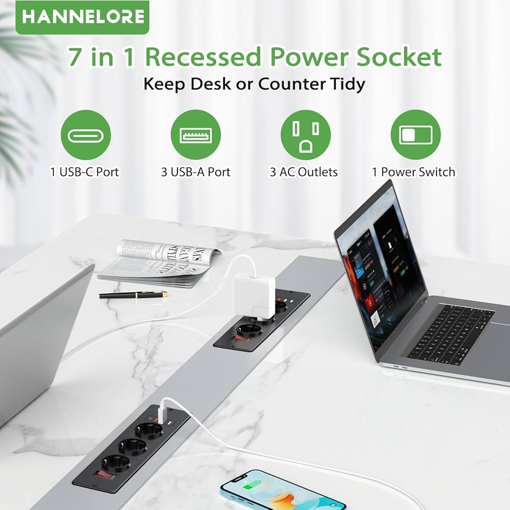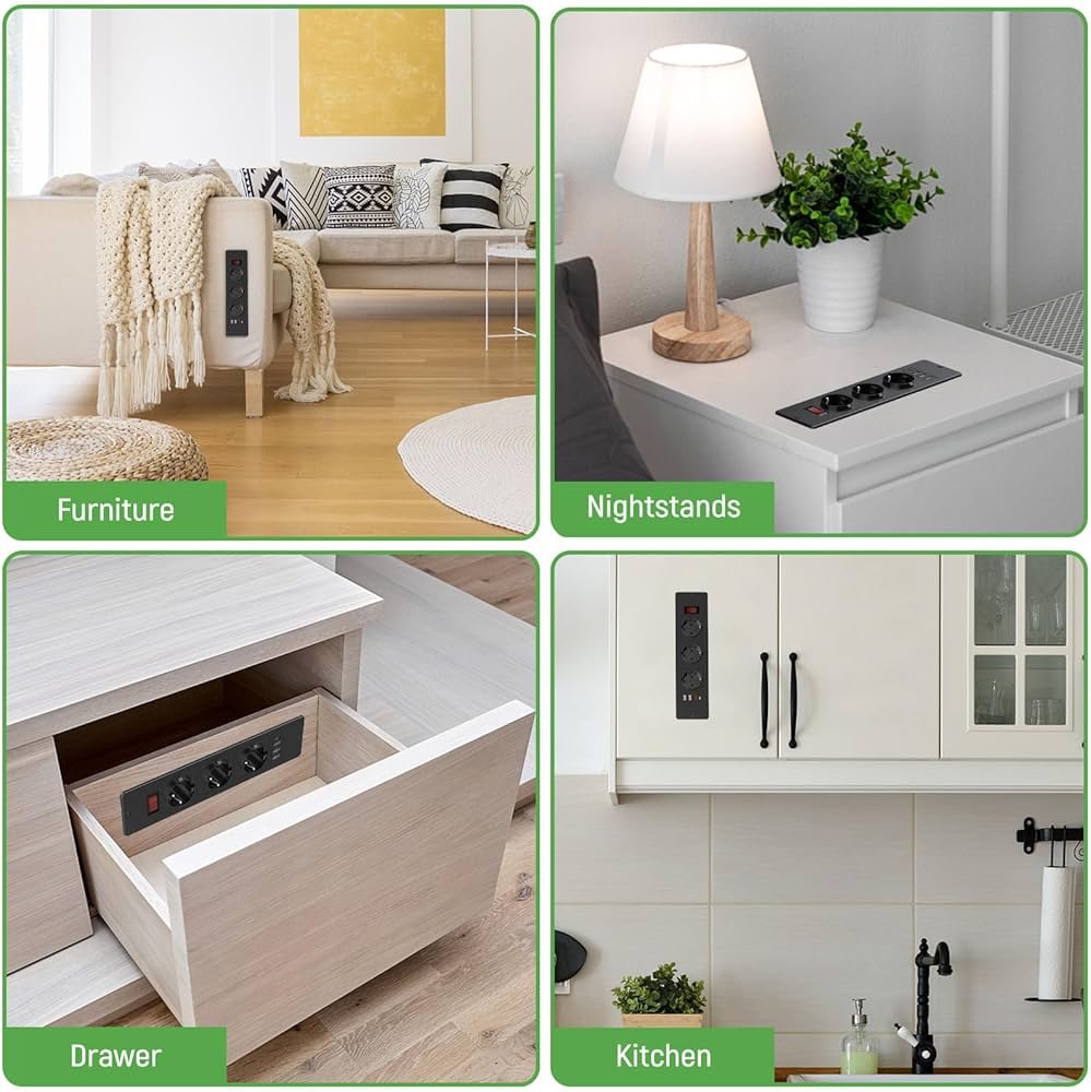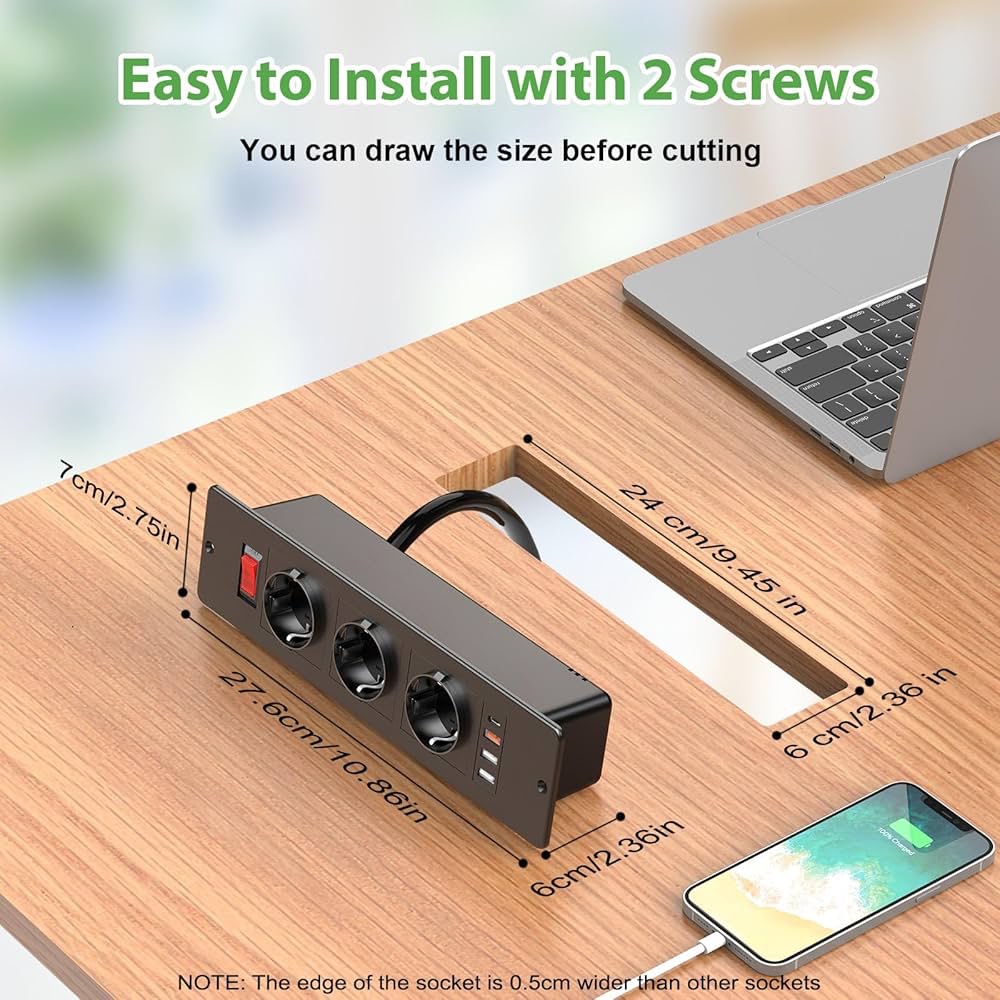 پریز رومیزی با USB C مدل PD20W، پریز توکار، 3 پریز با 3 پورت USB A، چندراهی برق توکار با 2 پیچ برای روی میز، میز کار، مبلمان، آشپزخانه، کابل 2 متری، 10 آمپر/2500 وات، مشکی