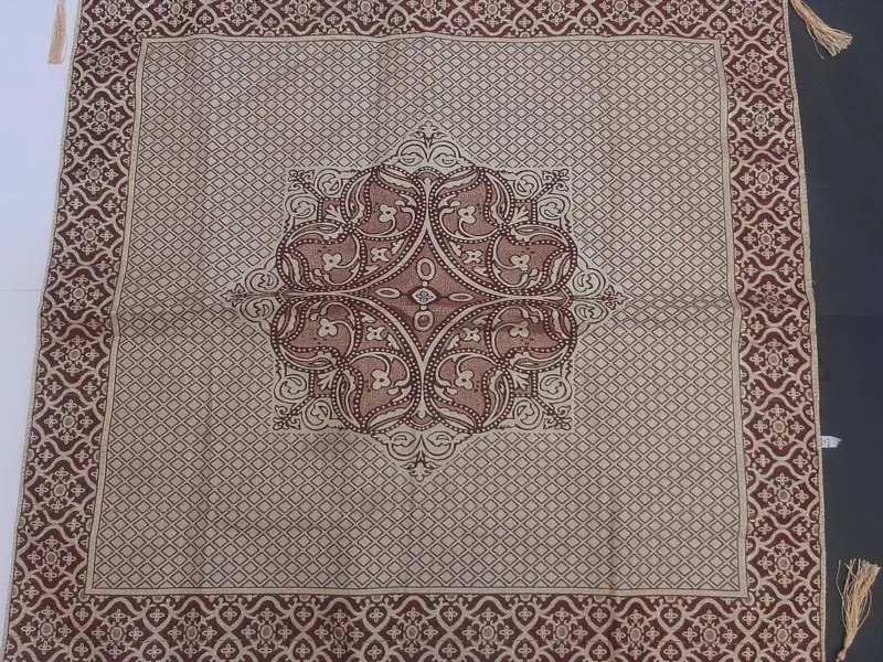 رومیزی زربافت خارجی . مربع 82 × 82 سانتی متر . کناره های رومیزی دارای آویز زری .