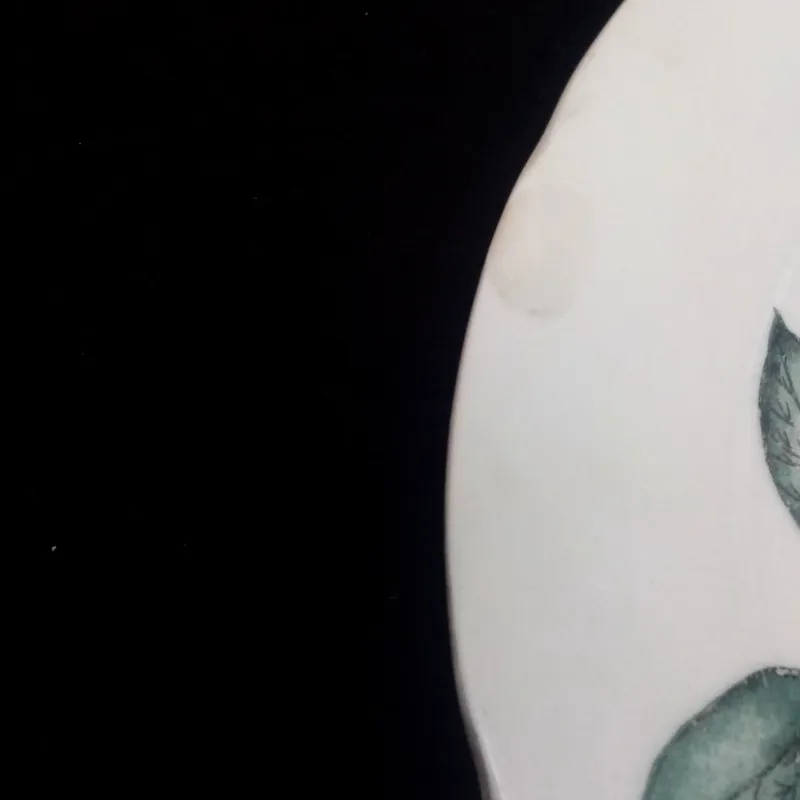 بشقاب تخت 23 سانتی گل رز تک شاخه مارک کایزر ساخت آلمان دوره پهلوی با برگ های سبزرنگ کمیاب. درعکس آخر رنگ رفتگی 2سانتی مشاهده میشود که فرورفتگی ندارد وکاملا هم سطح میباشد فقط لکه یا لعاب رفتگی کوچک است که در قیمت لحاظ گردیده است.